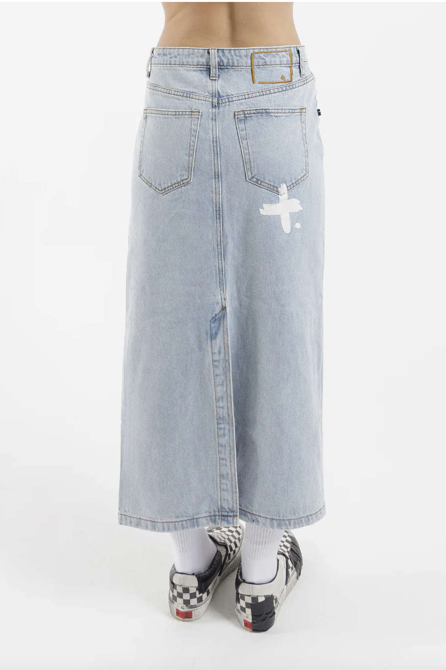 Classic denim features and back split for easy movement. Complete with a white printed +. on the back right had side pocket.