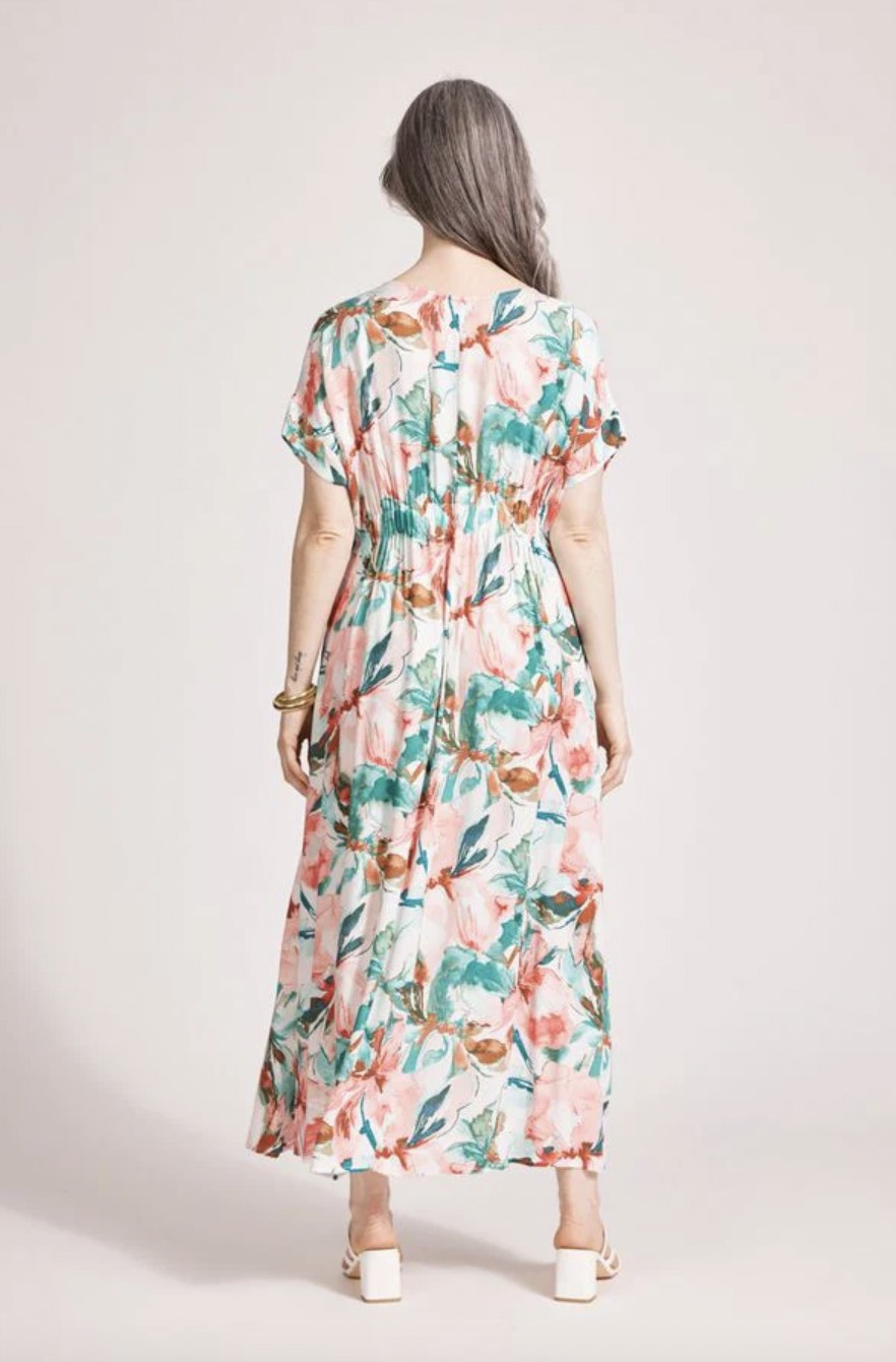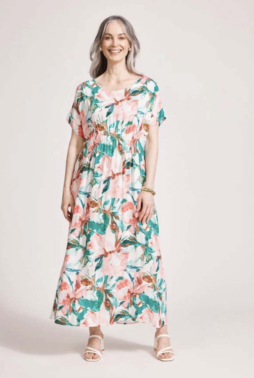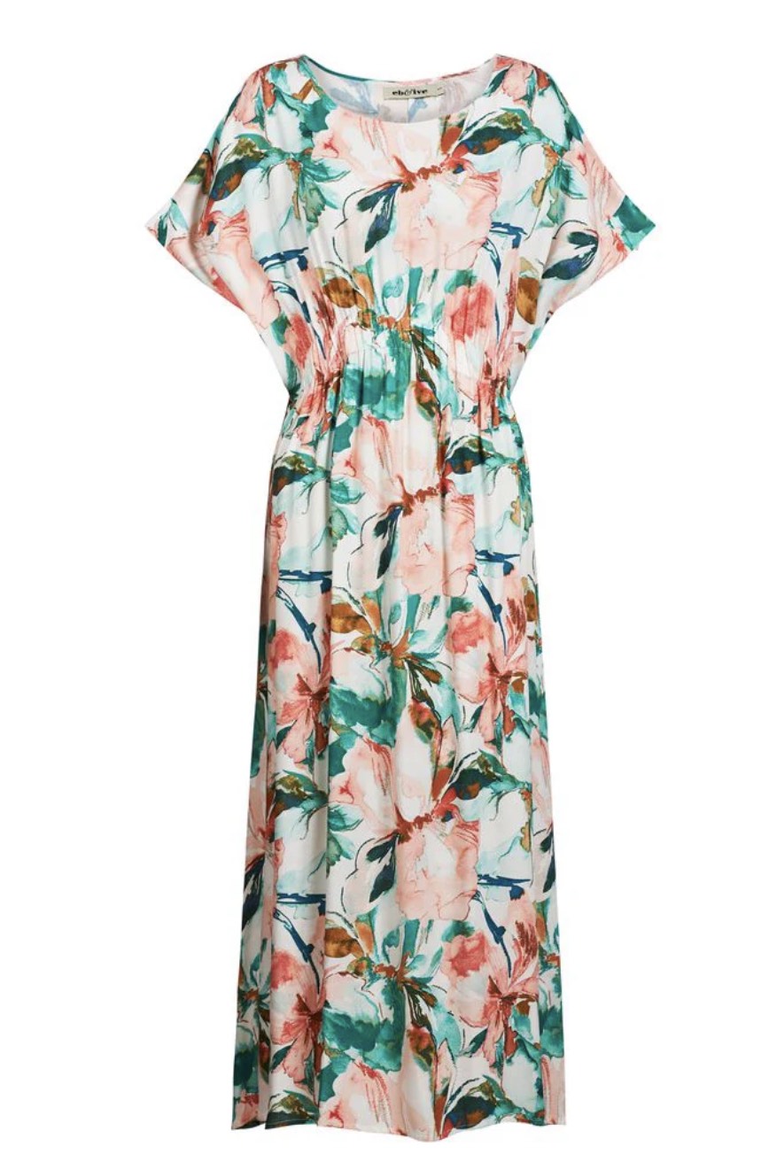 A light, easy-wear style perfect for summer. Features a round neckline, elastic detail at the waist and back, and functional pockets. Crafted from soft, flowing fabric with a relaxed fit that falls to mid-calf.