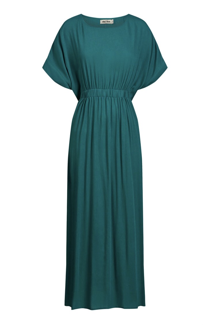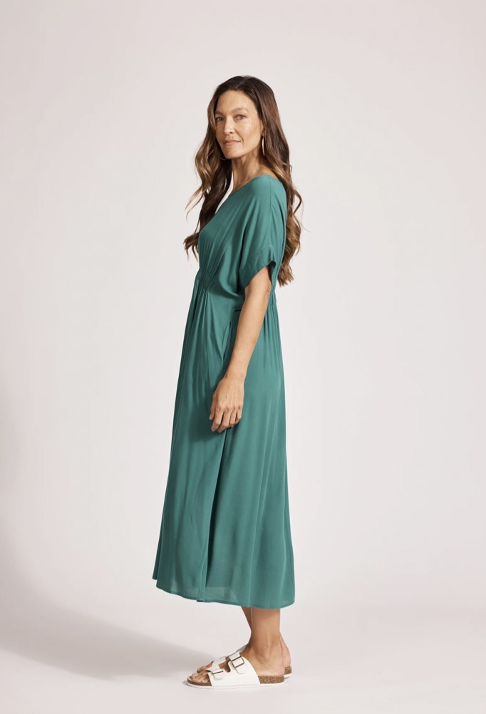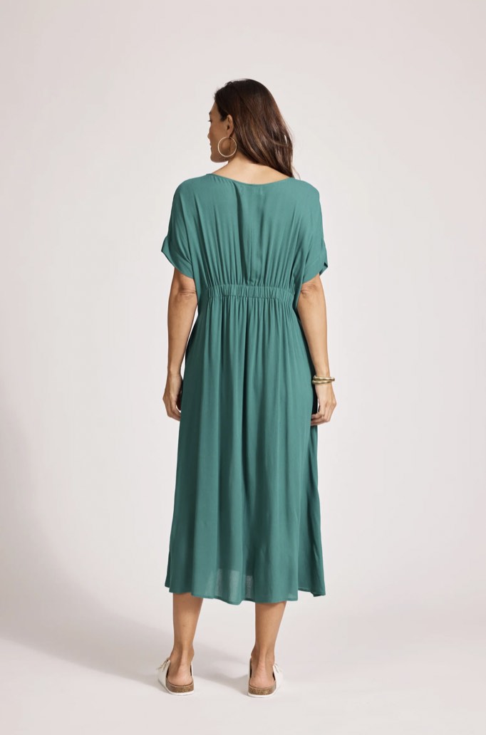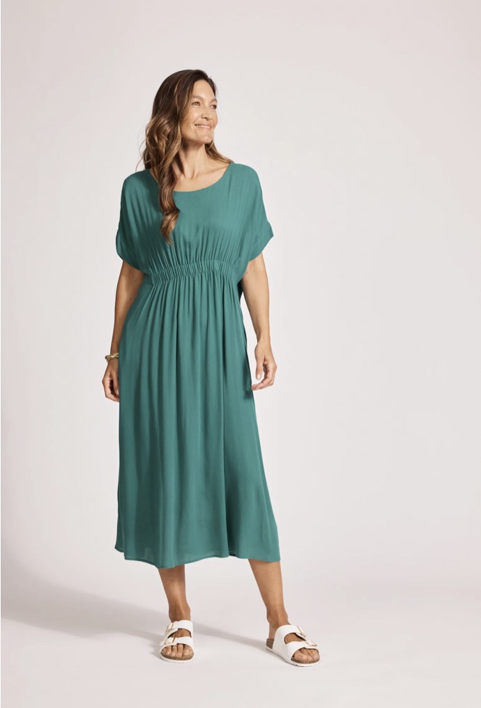 A light, easy-wear style perfect for summer. Features a round neckline, elastic detail at the waist and back, and functional pockets. Crafted from soft, flowing fabric with a relaxed fit that falls to mid-calf.