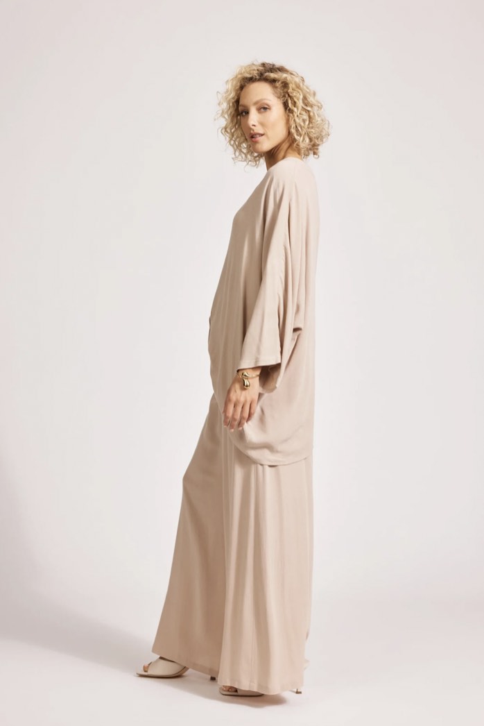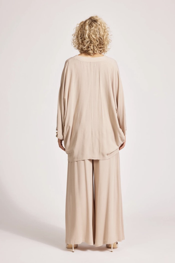 A relaxed top with soft drape and feminine detail. Features a V neckline, twist detail at the front, and a high-low hem. Designed in an easy one-size fit with long sleeves for lightweight coverage.
