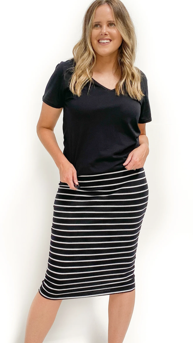 Classic, simple and great with tees, this pencil skirt is made from breathable soft knit cotton elastane that guarantees it’ll become a wear all-day favorite. This pull-on style is just as comfy as it is cute. That’s why she’s one of our hardest working essentials all year round
