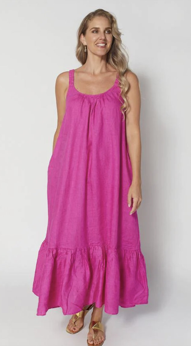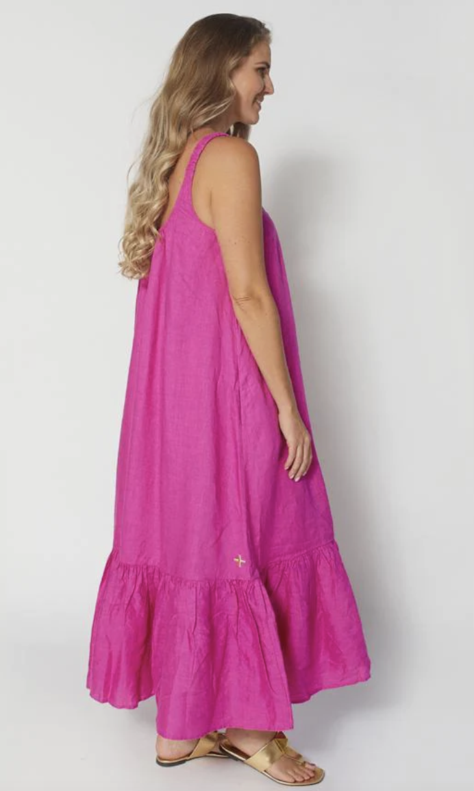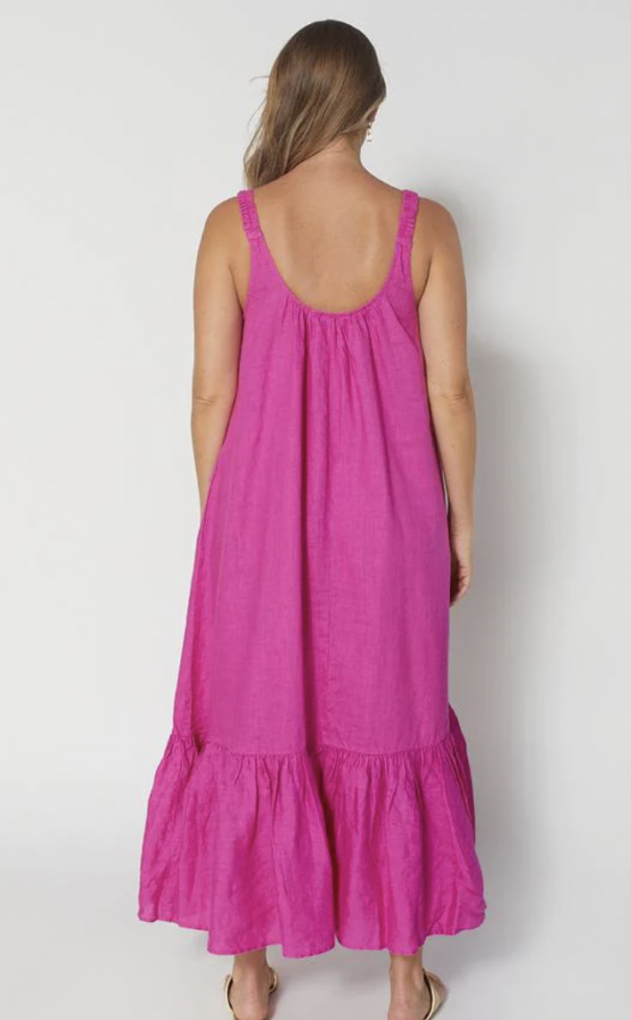 The Arianna dress is a gorgeous maxi dress with gathered hemline tier, elasticated shoulder straps and self fabric waist tie belt. It is perfect for all party occasions!