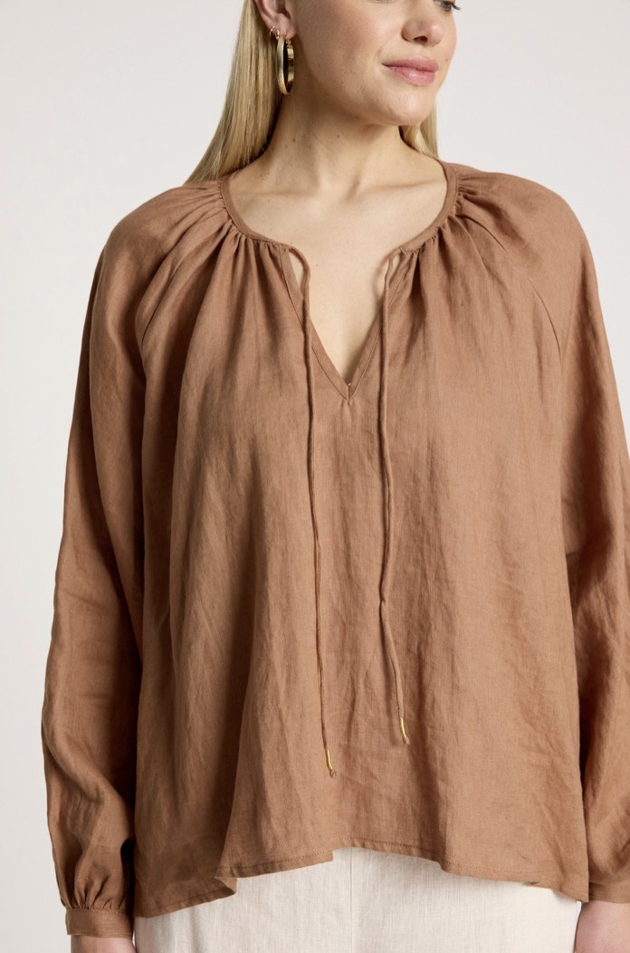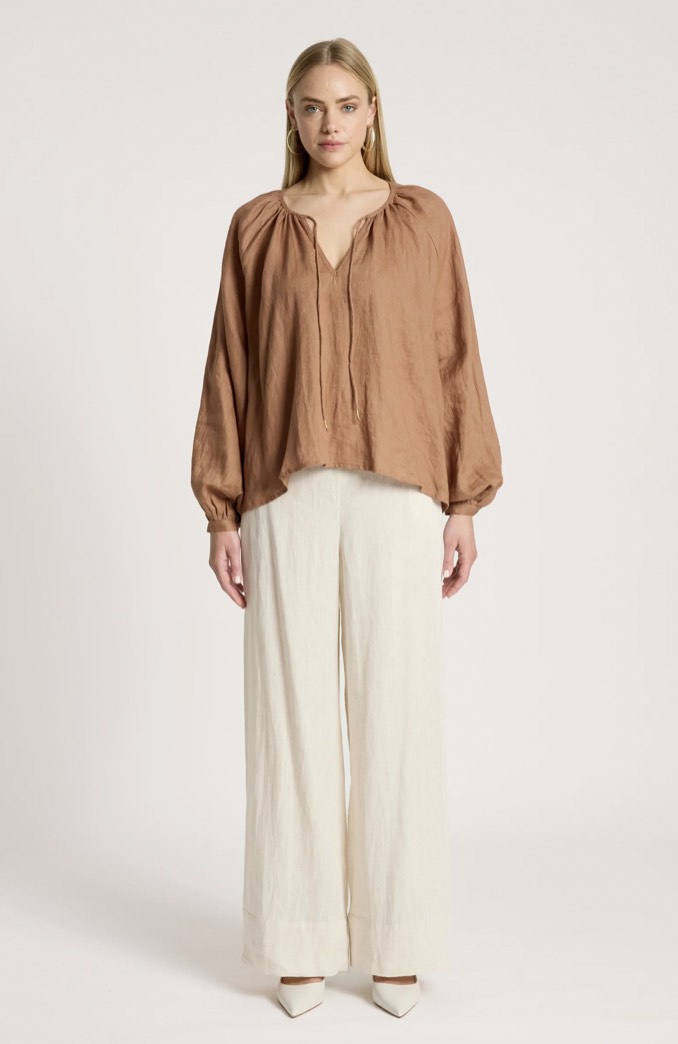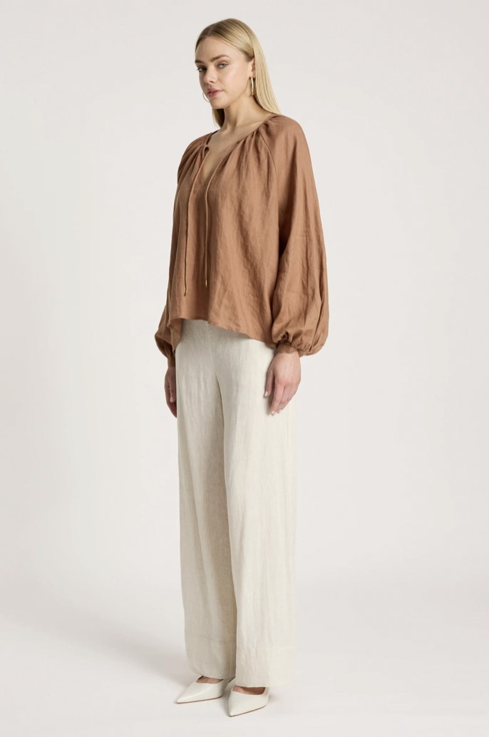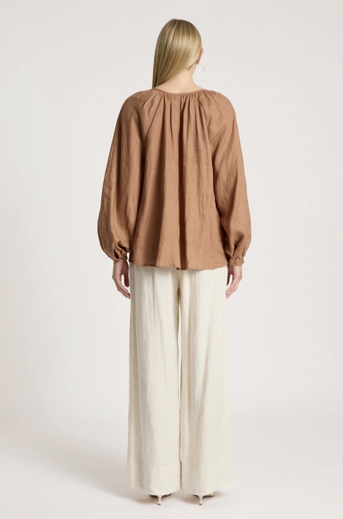 A refined blouse crafted from soft-washed 100% linen. The Bajau Blouse features a relaxed silhouette, softly bellowed sleeves with buttoned cuffs, and an open neckline finished with tie straps and understated thread detailing. Clean, breathable and elevated for everyday wear.