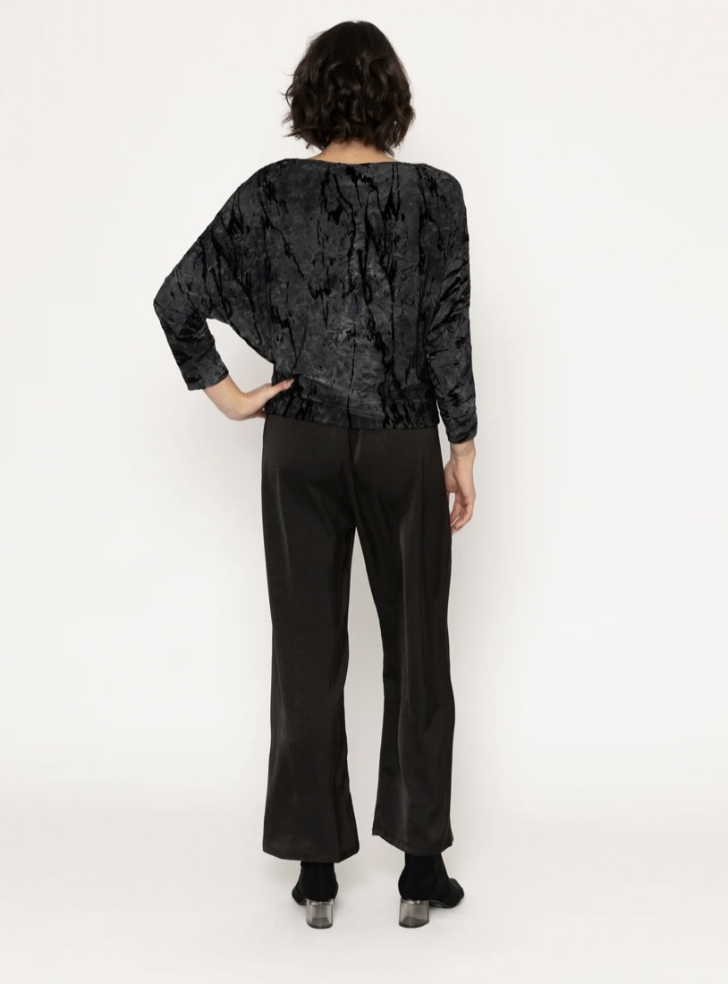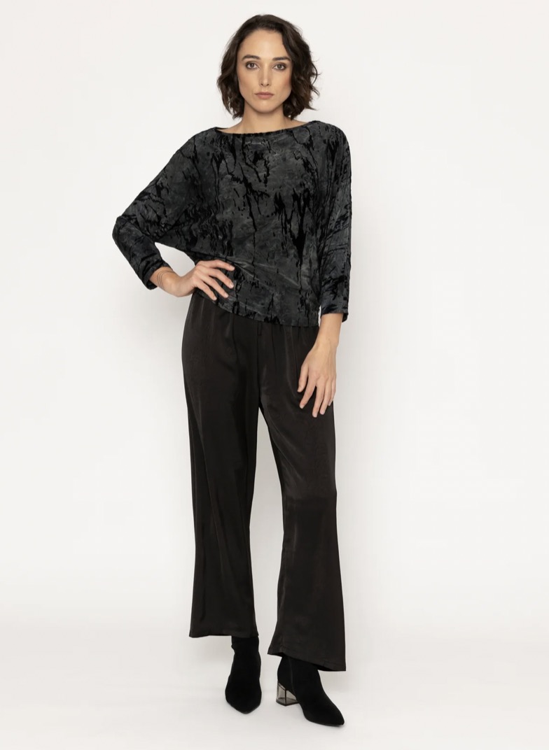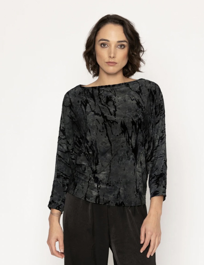 The Blair Top is a stylish slinky knit piece in a glitch print featuring a black base with grey/blue smudges. It boasts a flattering boat neck and kimono sleeves, with a sleek 7/8 cigarette-style lower sleeve for a modern, edgy touch. The clever pleat detail at the upper hip adds flattering lines, making this top versatile and flattering on many body shapes. Perfect for dressing up or down, this top is a chic addition to any wardrobe.