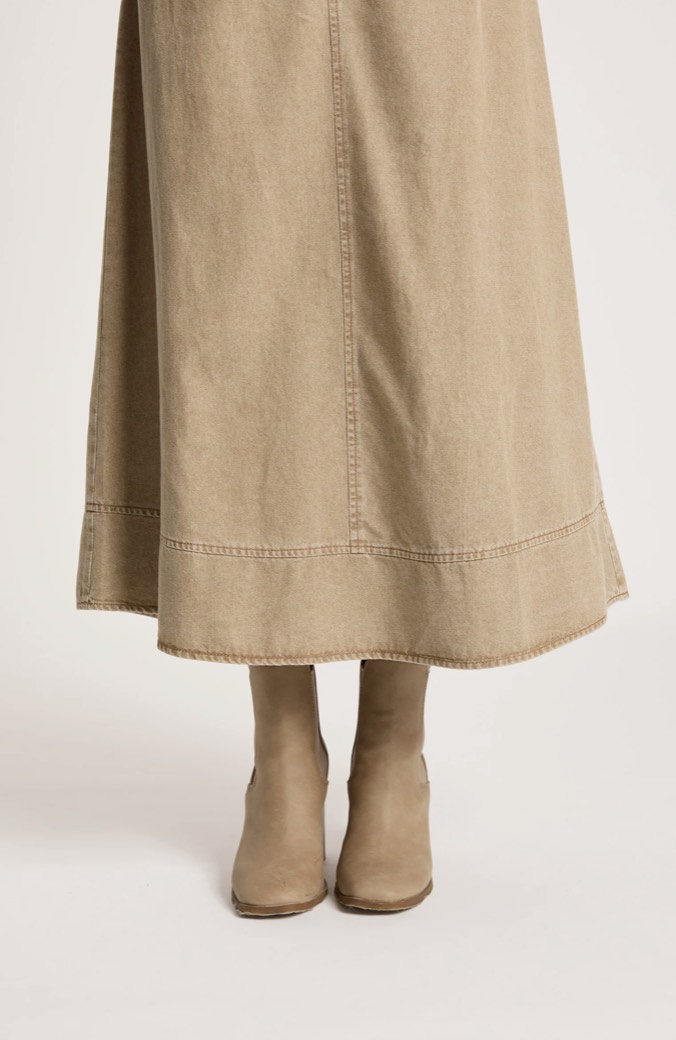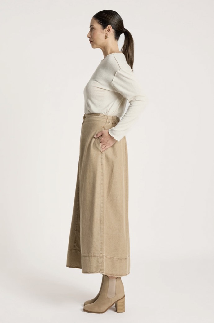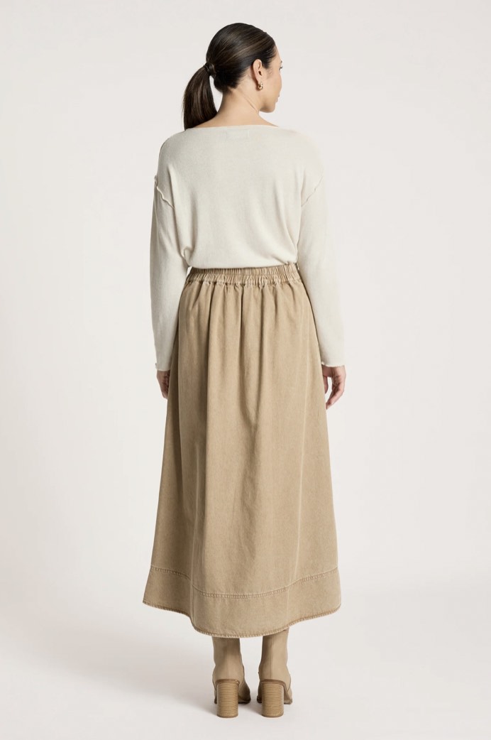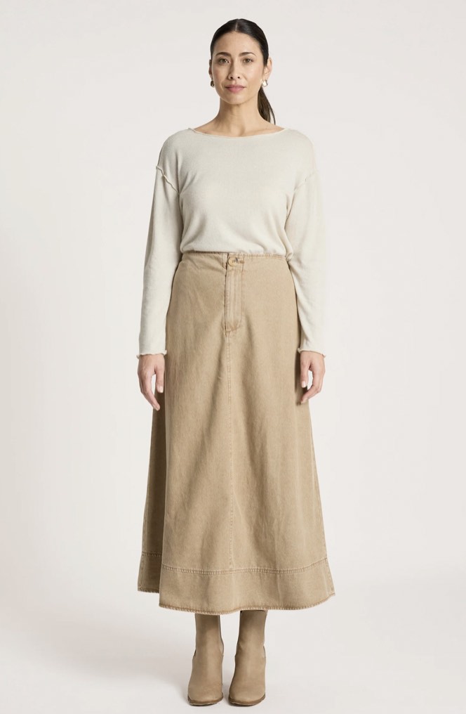 An on-trend A-line denim skirt designed for all-day comfort. Featuring a flat front waistband with button closure and an elasticated back for ease of wear, this style balances structure with flexibility. Finished with topstitch hem detailing and side pockets for practicality.