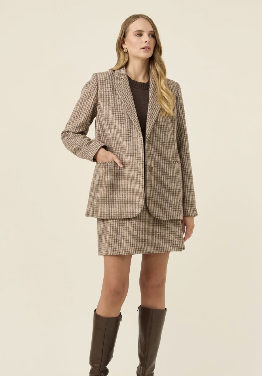 A classic houndstooth blazer cut in soft suiting fabric and fully lined for comfort. The notched lapel, diamond-shaped buttons and welt pockets bring a timeless tailored feel, while subtle shoulder padding adds light structure.