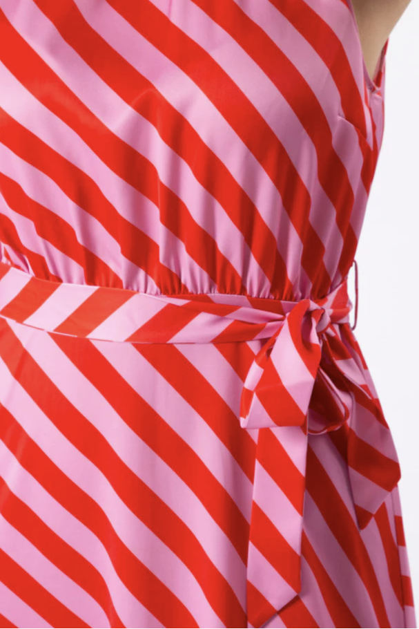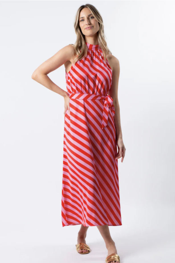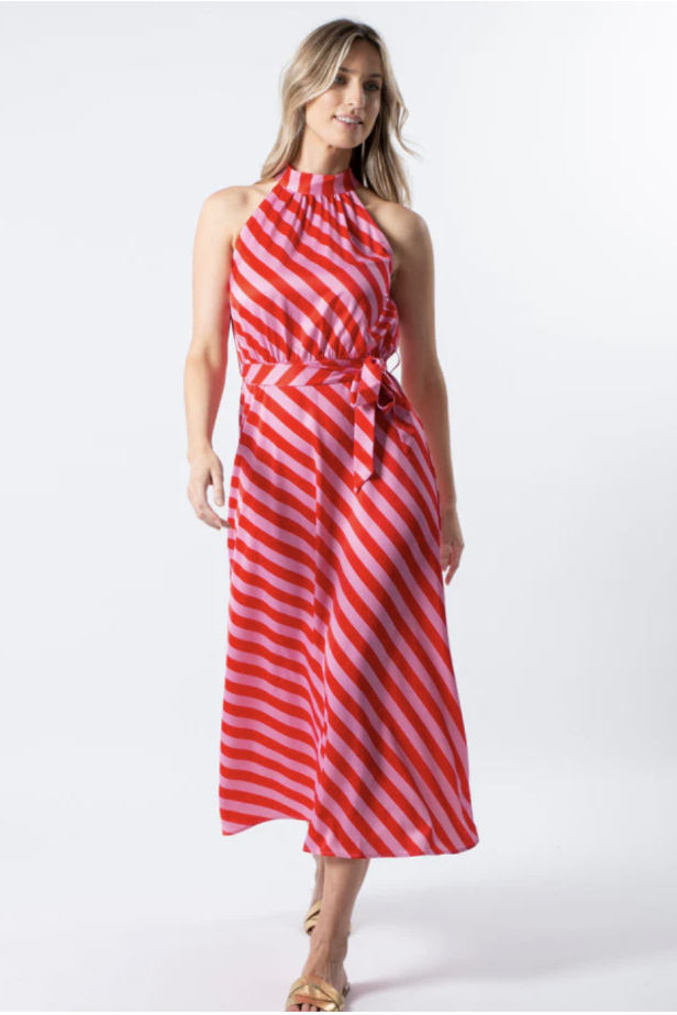 - Halter neck tiered dress with self fabric tie waist and keyhole split and button fastening at back neck