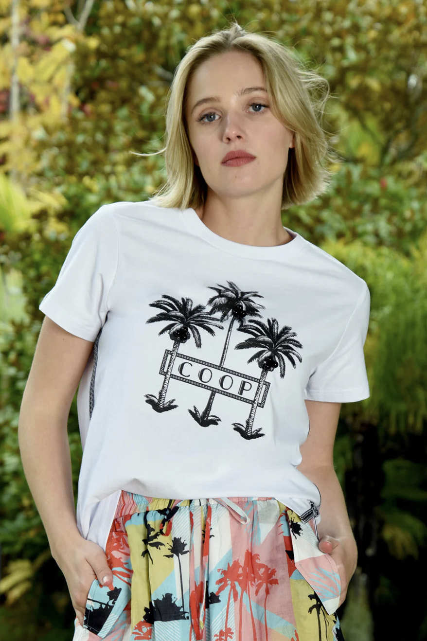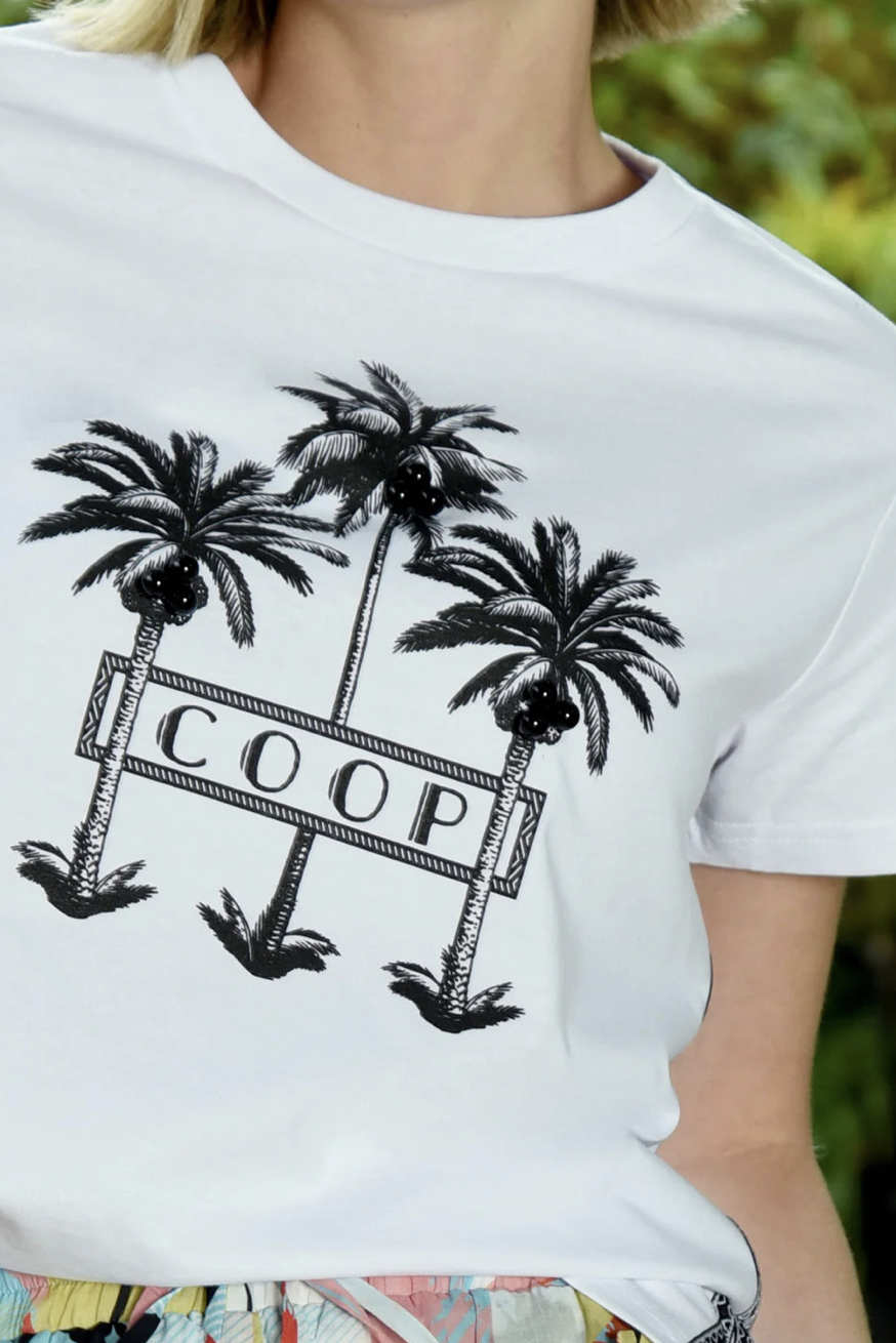 Add a fun touch to everyday outfits this season with the ‘Coconut Grove’ t-shirt. Crafted in the ‘Got to Tee There’ cotton t-shirting, this monochromatic piece features a tropical coconut palm motif, embellished with beads. A contrasting patterned tape finishes off the side seams of this summery tee for the perfect final accent.