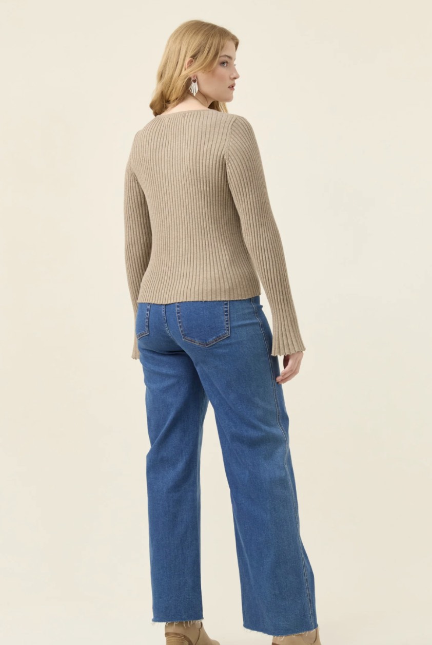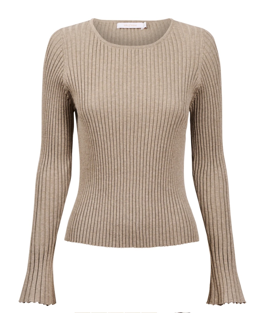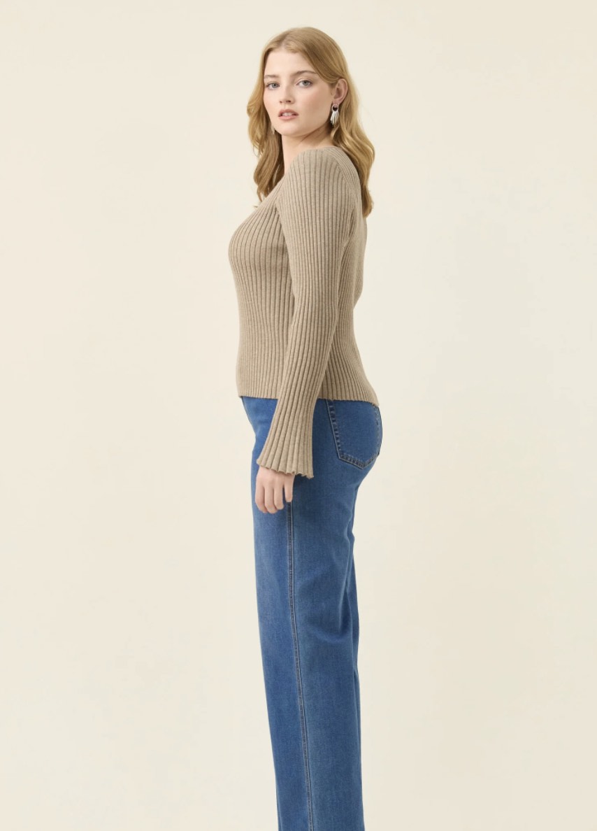 A lightweight ribbed knit top in a soft cotton-blend. The round neckline keeps it simple, while the fluted sleeves add a touch of movement and femininity to the silhouette.