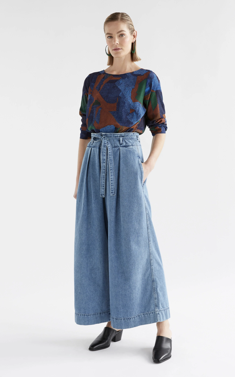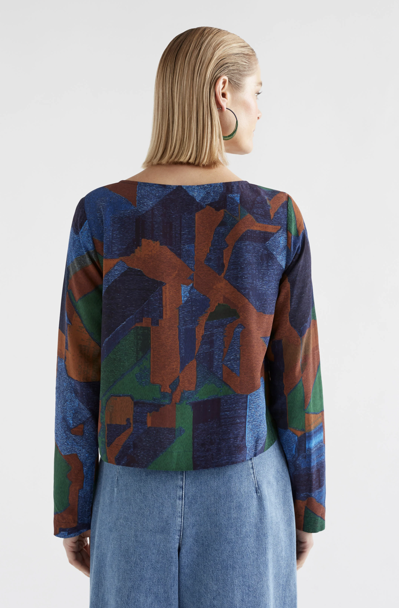 The Dega Top is a long sleeve top crafted from a printed ECOVERO™ viscose blend in the Orda print. This slightly cropped transseasonal staple features carefully placed bust darts, offering added shape through the bust and waist. Match the cool blue tones of the Orda print with the Arbet Jean for the perfect weekend look. The Orda print is a yardage print, meaning that print placement of the Dega Top will vary.