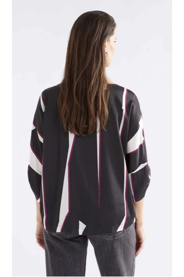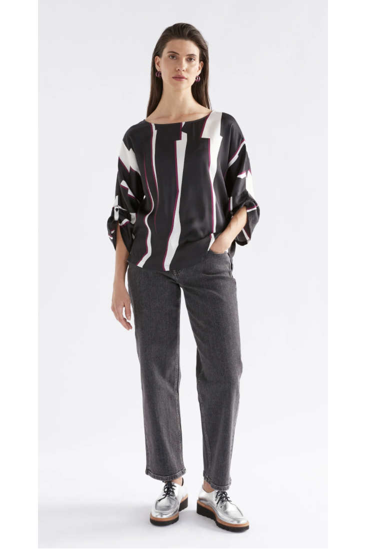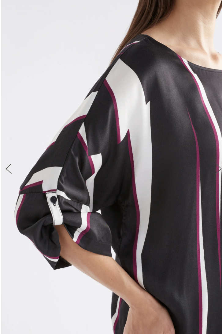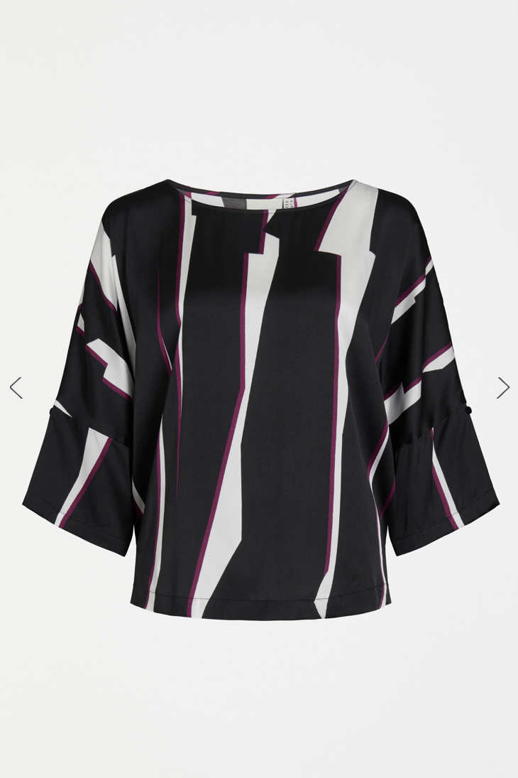 A silky, lightweight viscose sets the stage for the expressive Modular Print, showcased on this effortlessly versatile batwing blouse. The Devon Top features a scoop neckline and a fluid silhouette which create an elegant drape, whilst button-tab closures let you adjust the sleeves to suit your style. Designed with a standard body length, it tucks in seamlessly without adding bulk. The smooth, slightly glossy viscose drapes beautifully over the body, making it a refined staple for any wardrobe. Offered in the limited seasonal Modular Print.