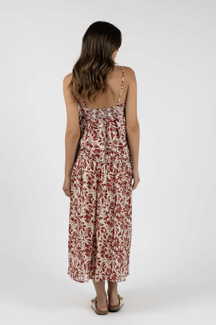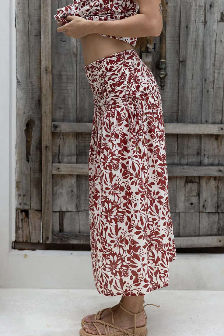 Elevate your wardrobe with our stylish midi-length skirt in the exclusive Humidity print. Featuring a wide, ruched waistband and an adjustable tie detail at the hip with chic gold ends, this skirt combines comfort with elegance. The invisible zipper at the back ensures a seamless look, while the lightweight, fully lined 100% cotton fabric drapes beautifully, falling just below mid-ankle on average height. Perfect for dressing up or down!