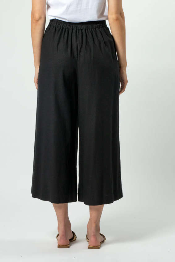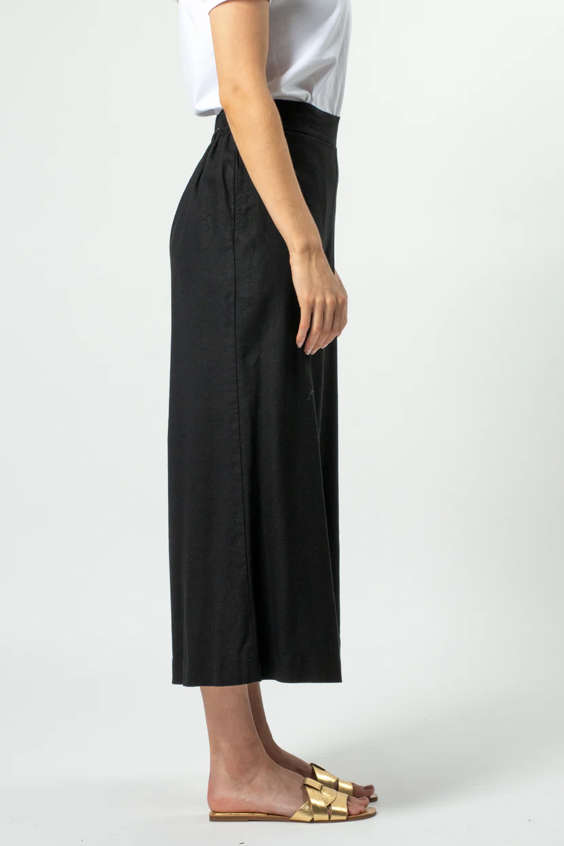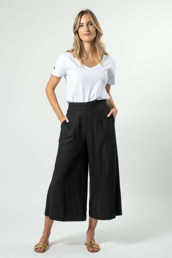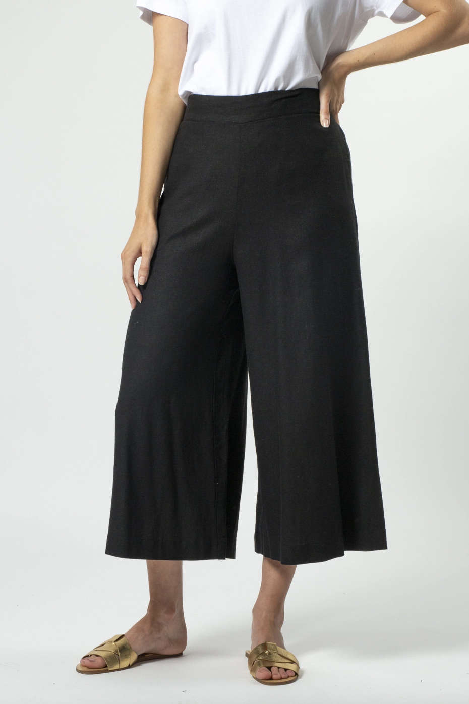 Cropped wide leg pant with flat front waistband, elasticated back waist and side seam pockets
