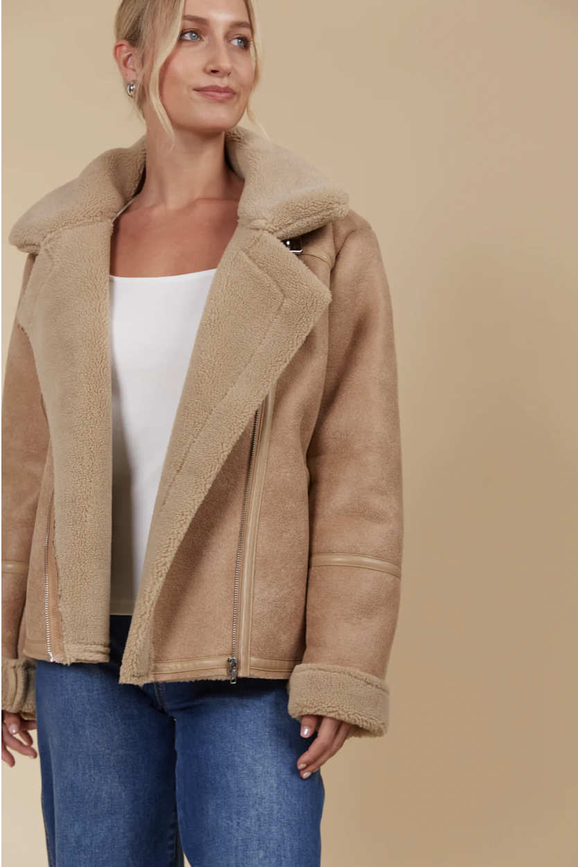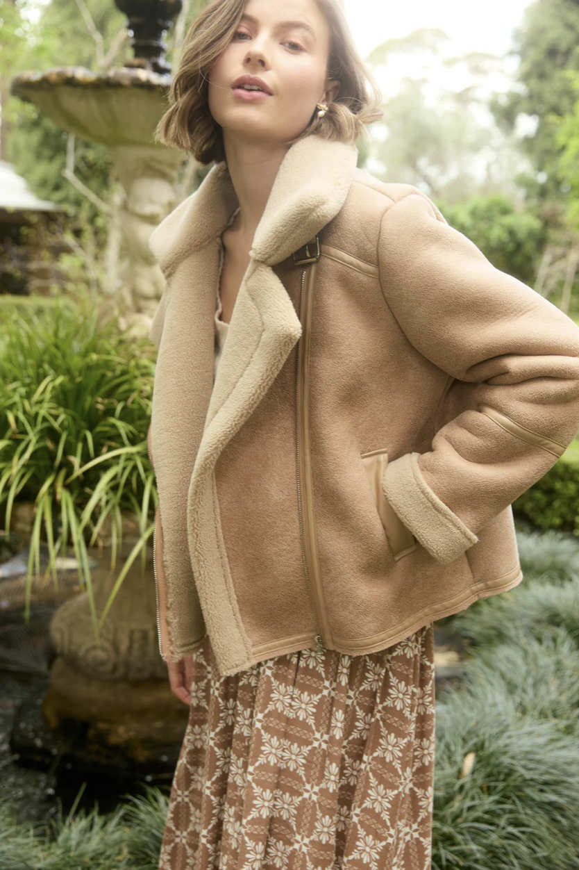 The Eris Jacket embodies classic winter style with its cosy shearling lining that extends from the lapels to the cuffs for additional warmth. The zipper closure adds an extra layer of protection against chilly weather. Perfect for icy winter days, this jacket pairs beautifully over a knit top, maxi skirt, or jeans and boots for a chic winter look.
