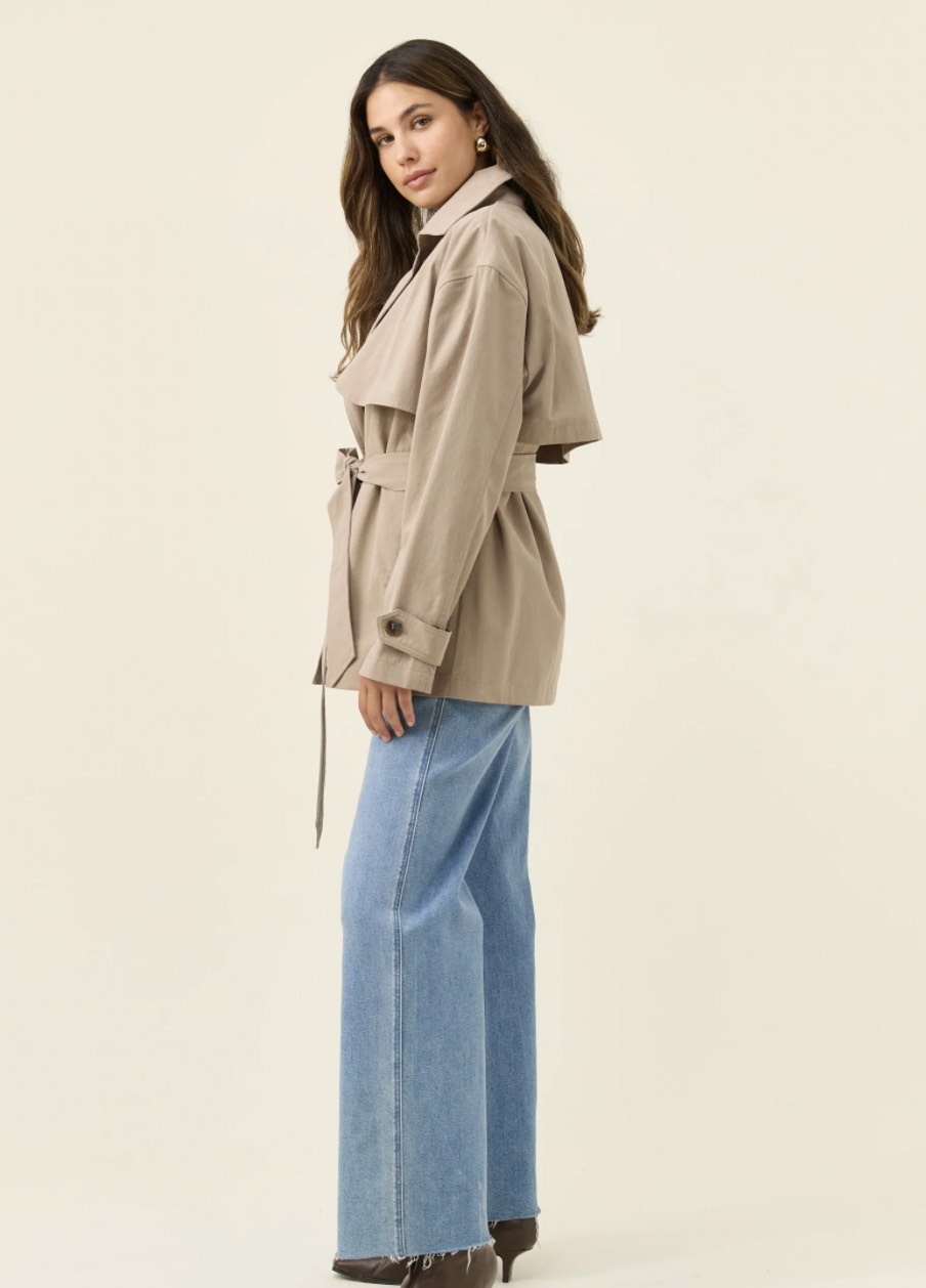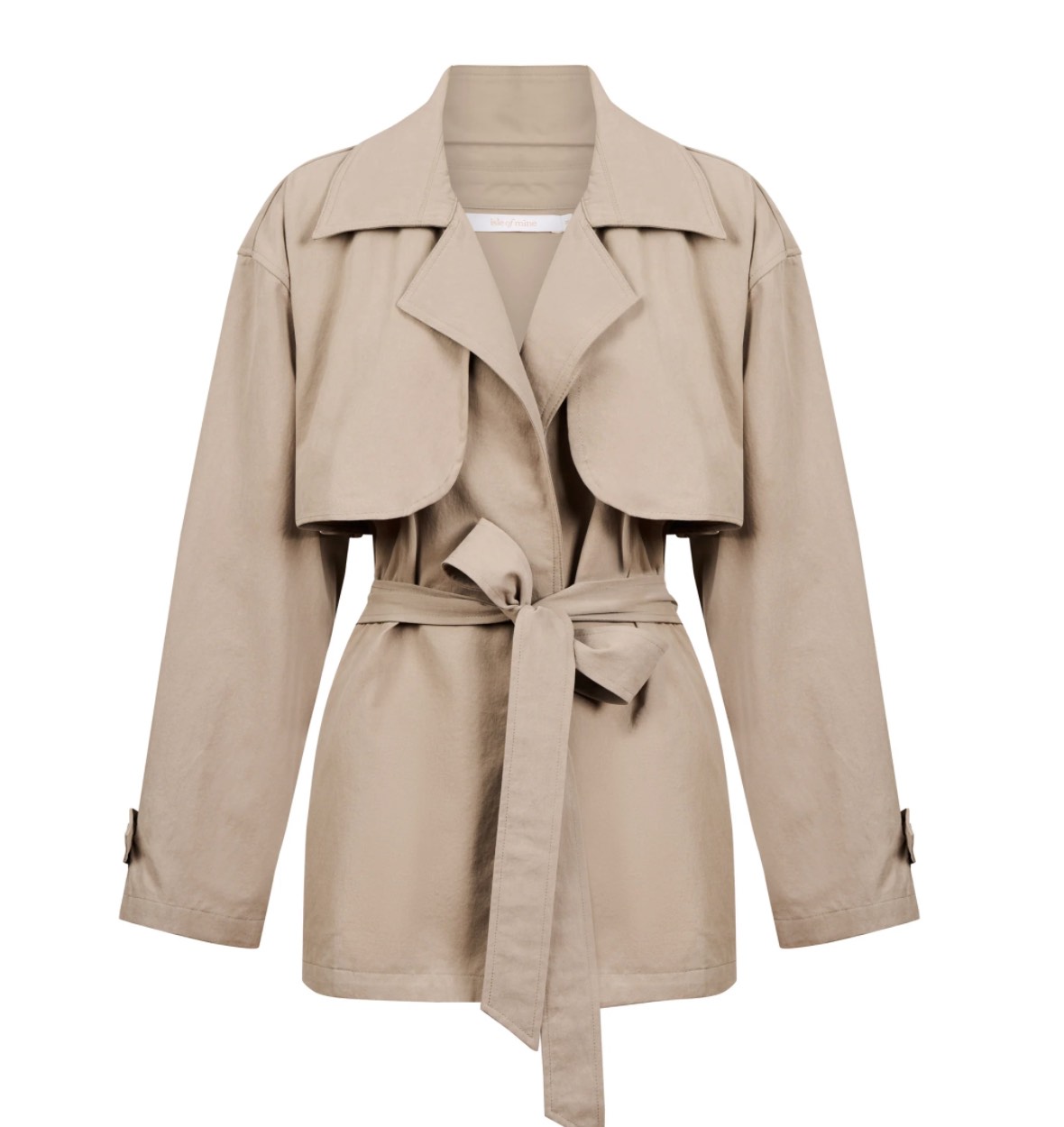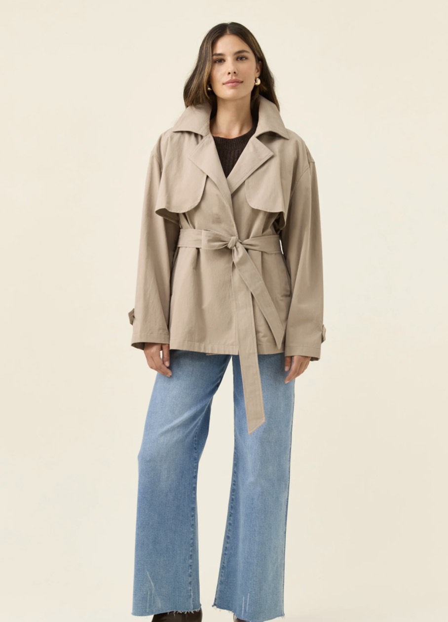 A modern cropped trench crafted from brushed cotton for a soft, textured hand-feel. The storm flaps and notched collar bring classic trench detailing, balanced by a self-fabric belt that lets you shape the waist as you choose. Welt pockets and clean tailoring make it a versatile winter layer.