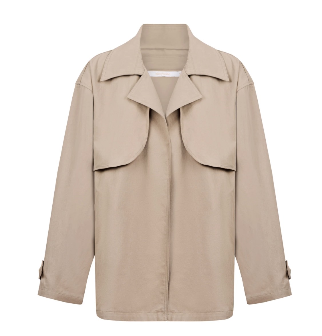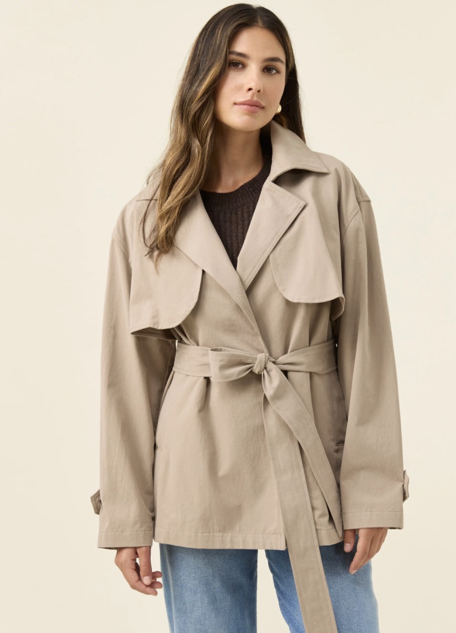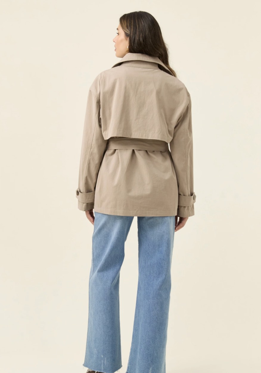A modern cropped trench crafted from brushed cotton for a soft, textured hand-feel. The storm flaps and notched collar bring classic trench detailing, balanced by a self-fabric belt that lets you shape the waist as you choose. Welt pockets and clean tailoring make it a versatile winter layer.