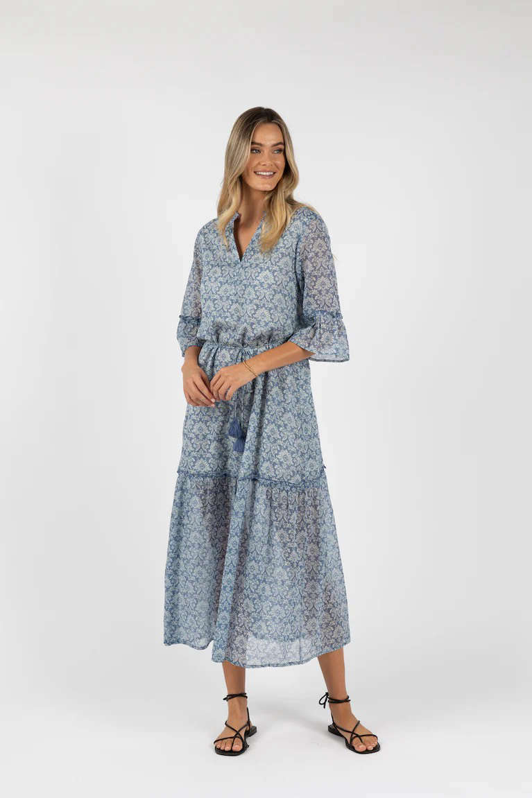 Introducing the Fiesta Aries Dress, a stunning lightweight midi/maxi style featuring our exclusive Aries print. Fitted at the chest and roomy through the hips, this dress showcases fluted short sleeves with frill detailing and a flattering V-neck. The removable waist tie, complete with tassels, can be styled at the front or back, or easily removed for a more relaxed look. With a tiered skirt designed for beautiful drape and a fully lined body, this dress is perfect for any occasion.