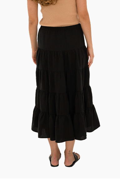 This stunning Florida Skirt will transport you to balmy summer nights. Flowing from the waist, it falls in tiers to a midi length full silhouette – making it perfect for twirling on the dance floor or floating your way through summer .• Elastic waist band with grosgrain tie detail for easy adjustment and a comfortable fit.