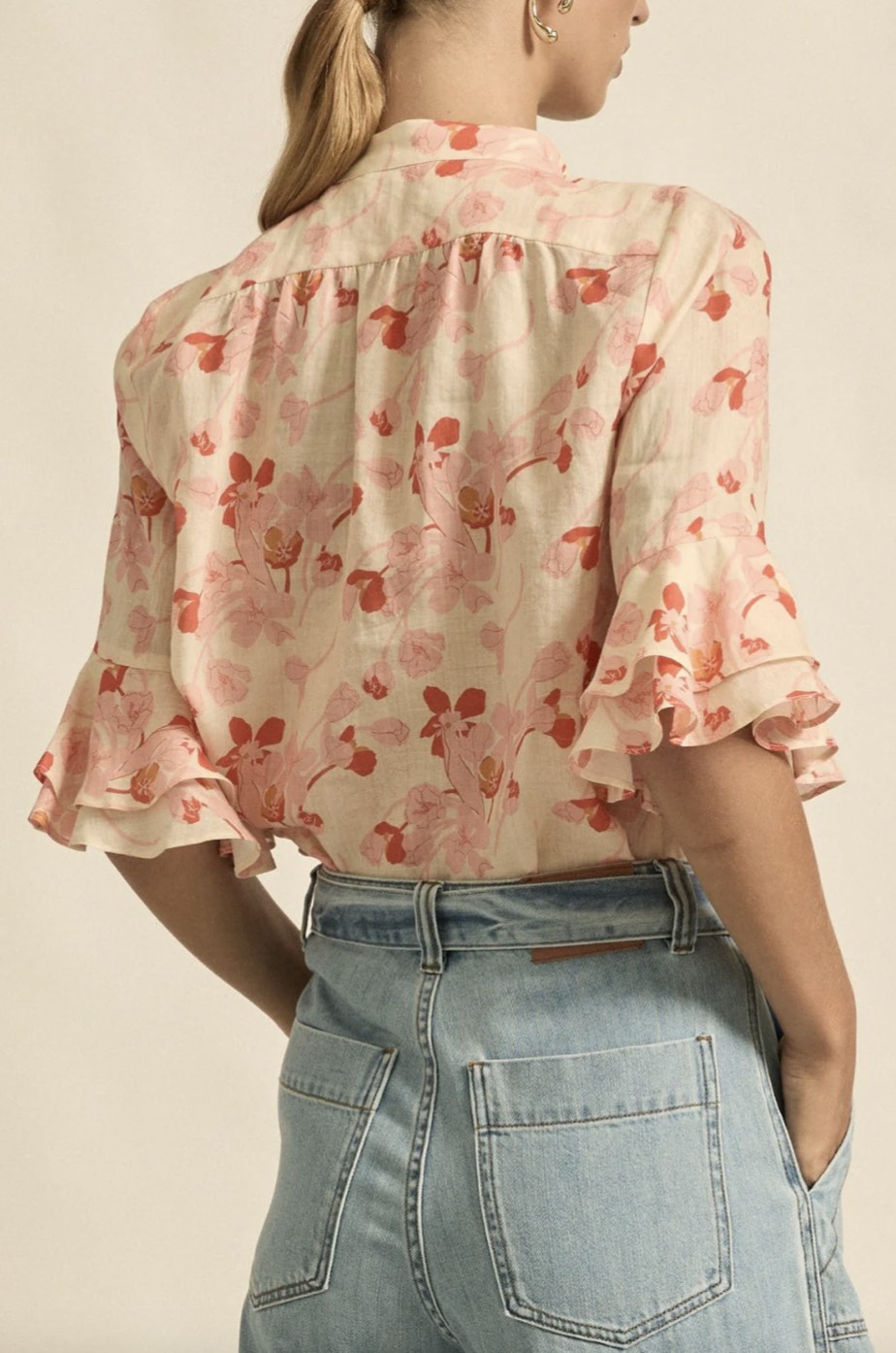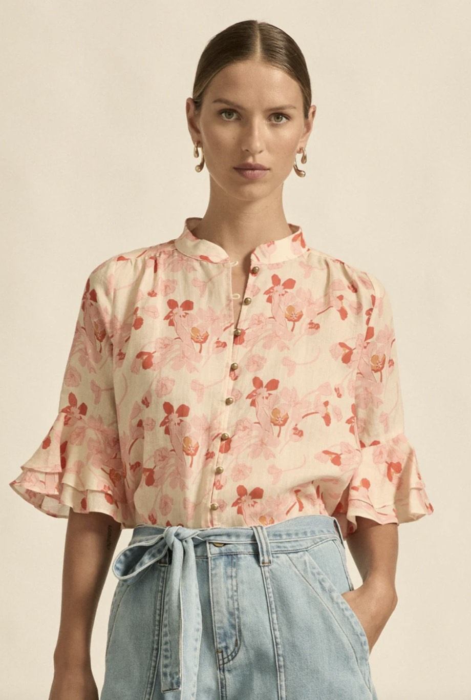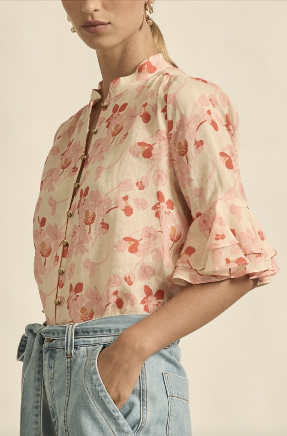 Delicate and softly feminine, the fluctuate top is defined by its flutter ruffled sleeves and antique-inspired fastenings.