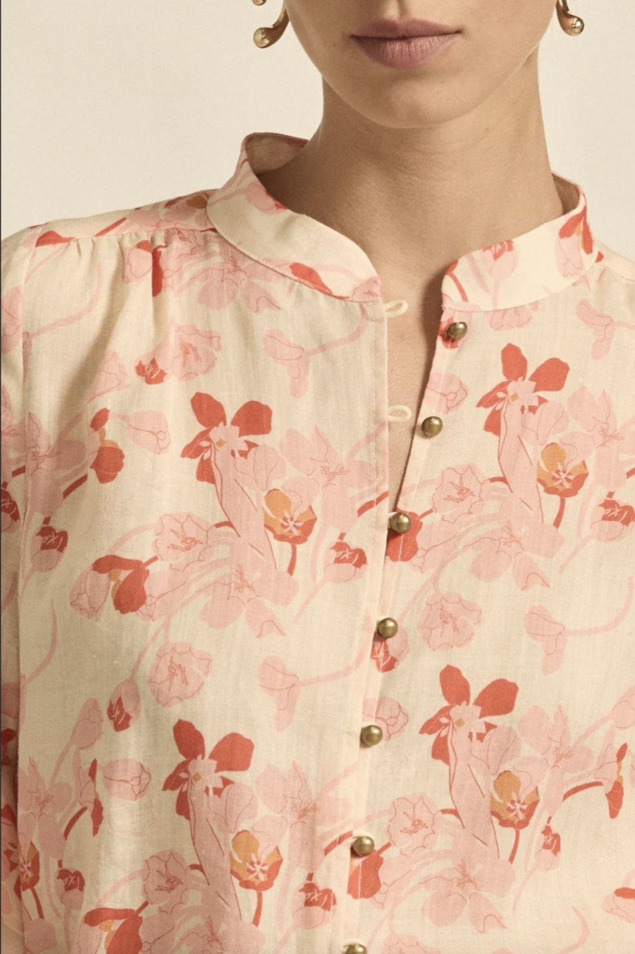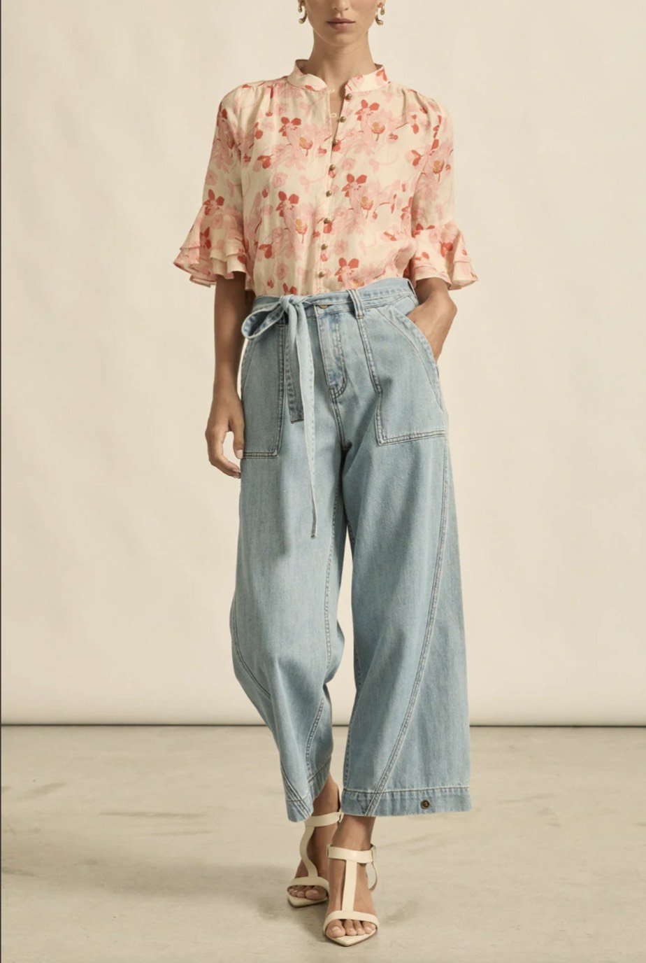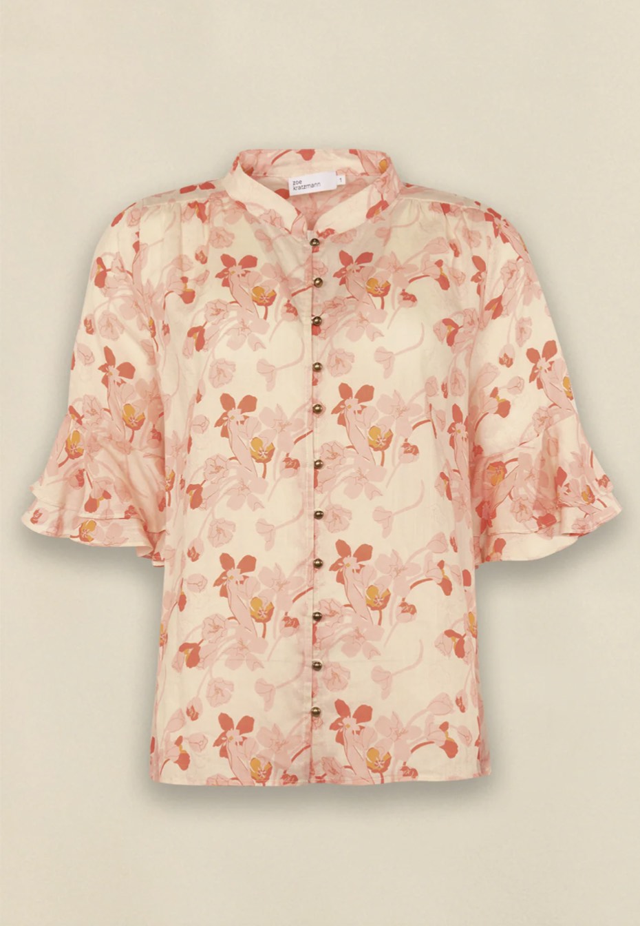 Delicate and softly feminine, the fluctuate top is defined by its flutter ruffled sleeves and antique-inspired fastenings.