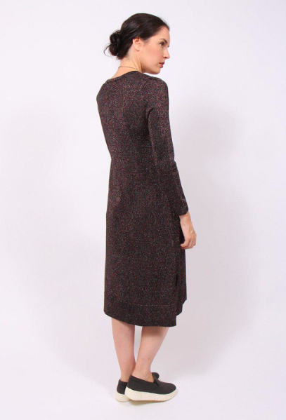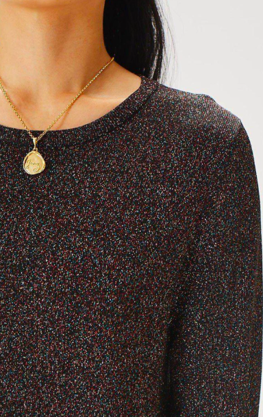 The Galaxy Knit Dress is a round-neck knitted dress with a long, set-in sleeve. The dress has an A-line shape with side splits, and can be worn as a tunic. The fabric has a black base with a multi-metallic yarn knitted throughout, and has some weight and structure to it.