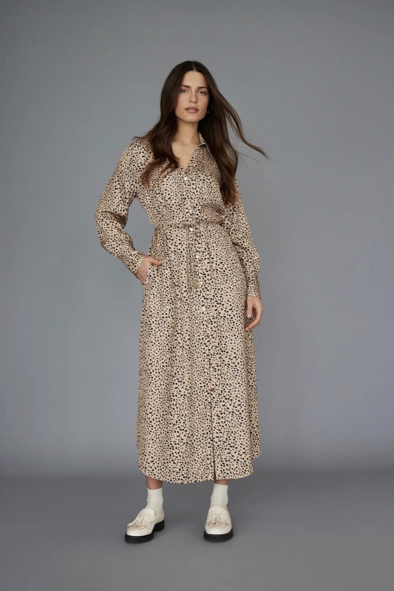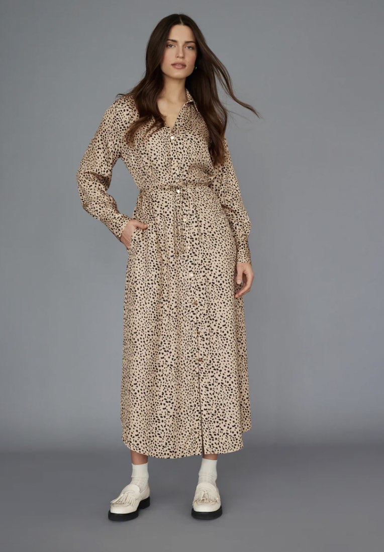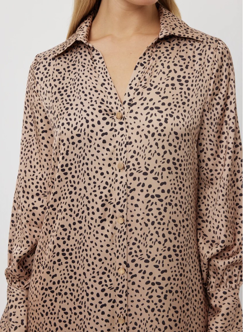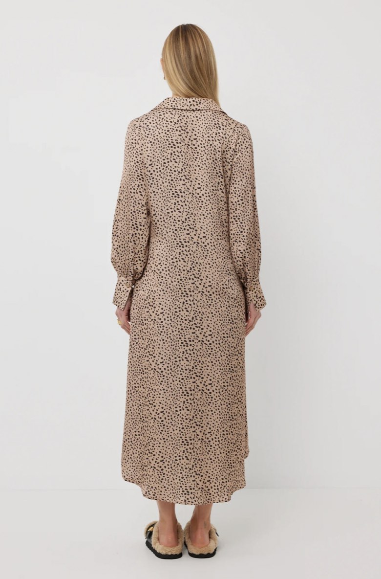 An incredible shirt-dress shape with stunning matte gold buttons. The fit is perfection with just the right amount of sex appeal and her sophisticated styling will take you from desk to dinner with ease – the full button through allowing you to conceal or expose skin as you desire.