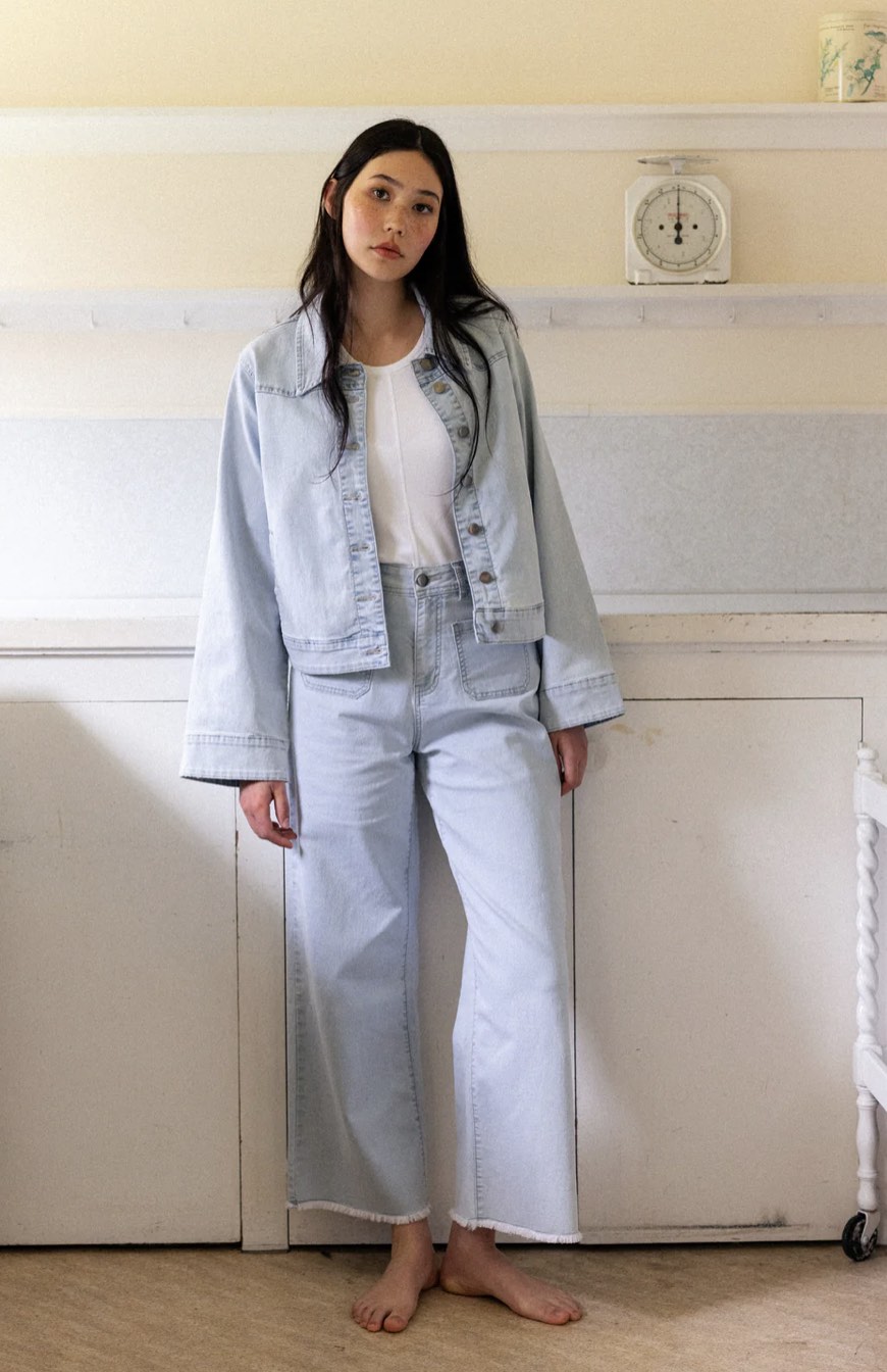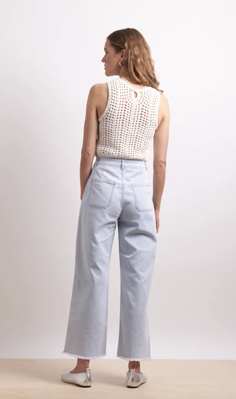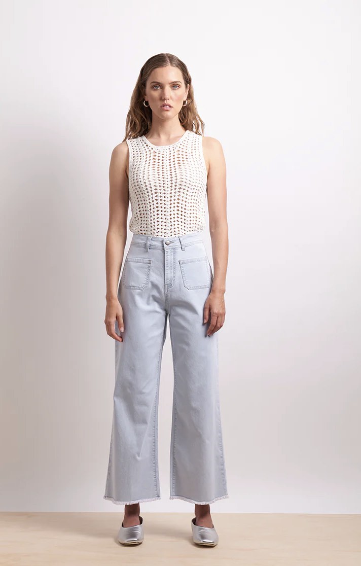 The Gigi Jean is a trendy style with a little bit of edge. Crafted  from a lightweight denim with stretch, this high-waisted silhouette has wide legs and a zip front fly with button. It features front patch pockets, and a raw frayed hem to create a versatile jean that can be worn in casual or dressier settings.
