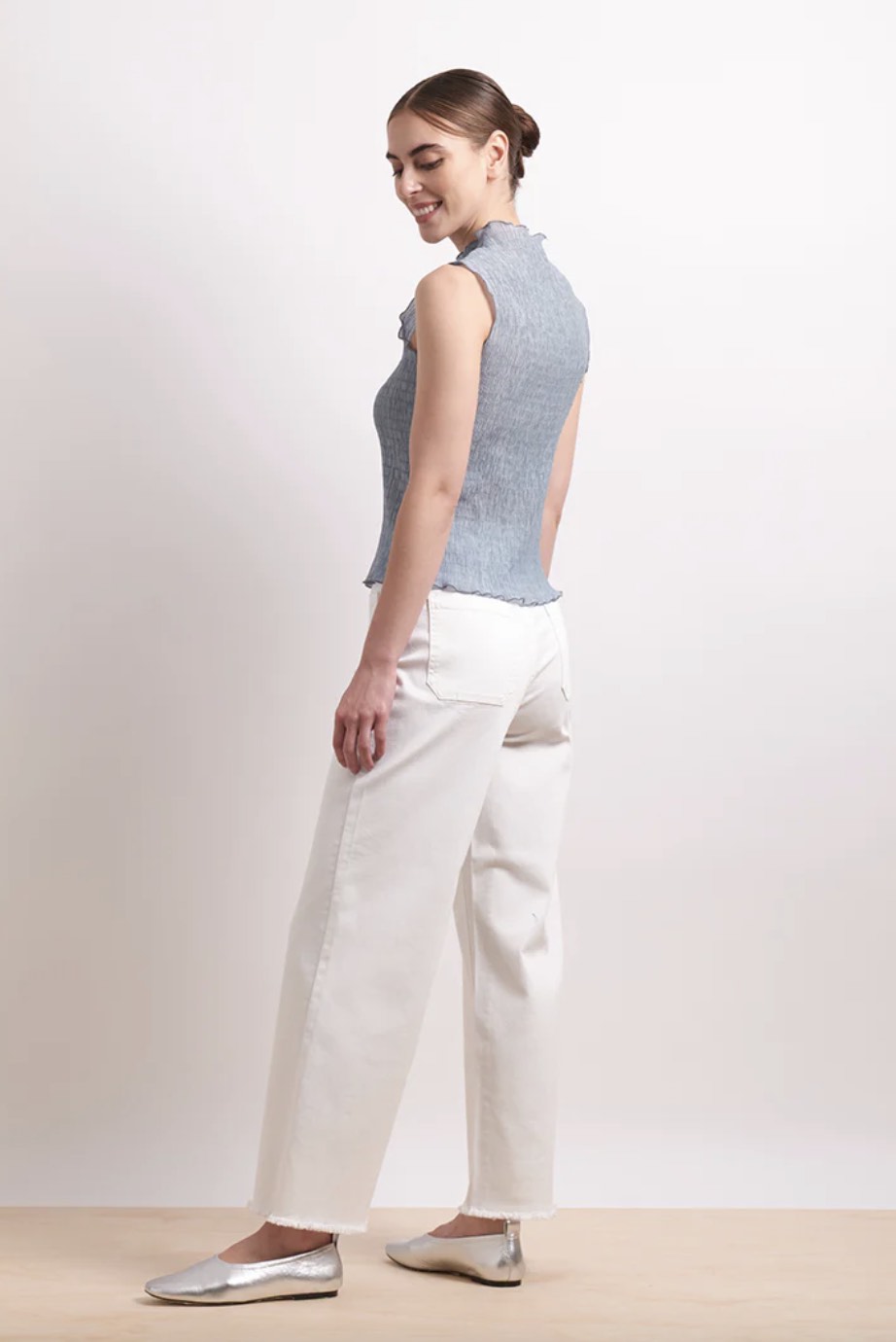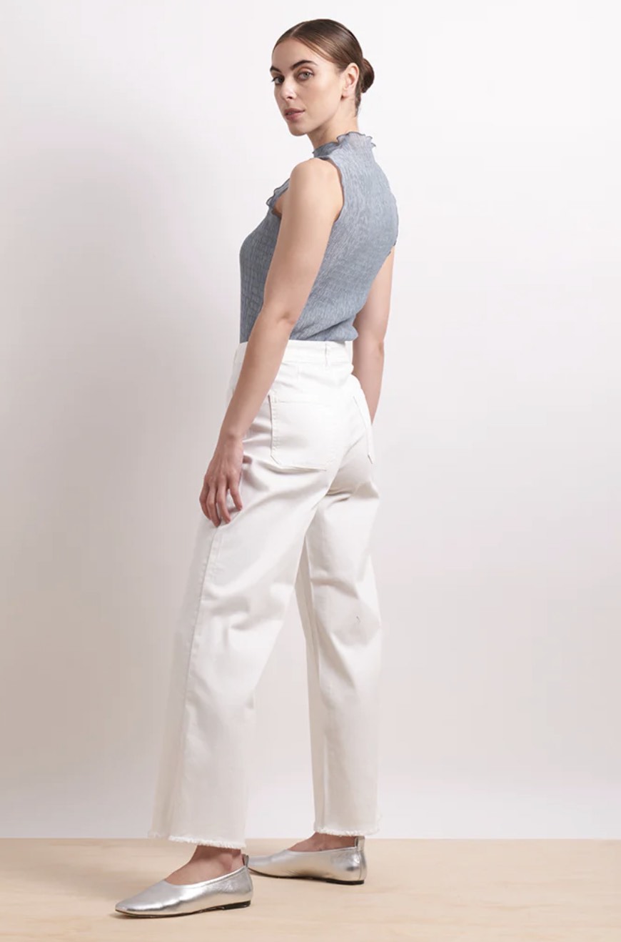 Crafted from a lightweight denim with stretch, this high-waisted silhouette has wide legs and a zip front fly with button.
