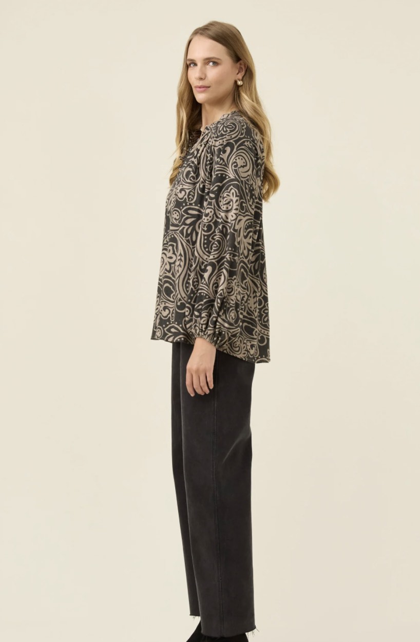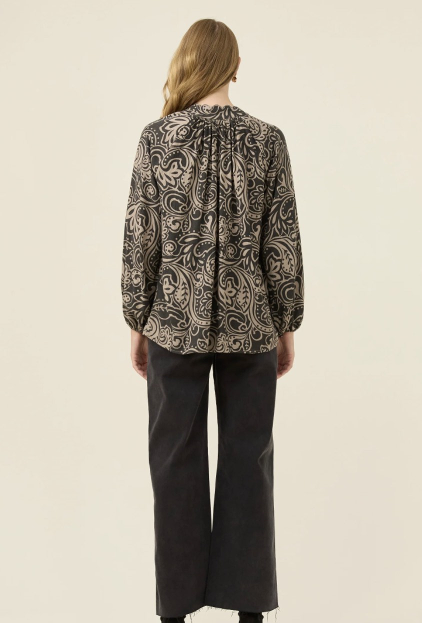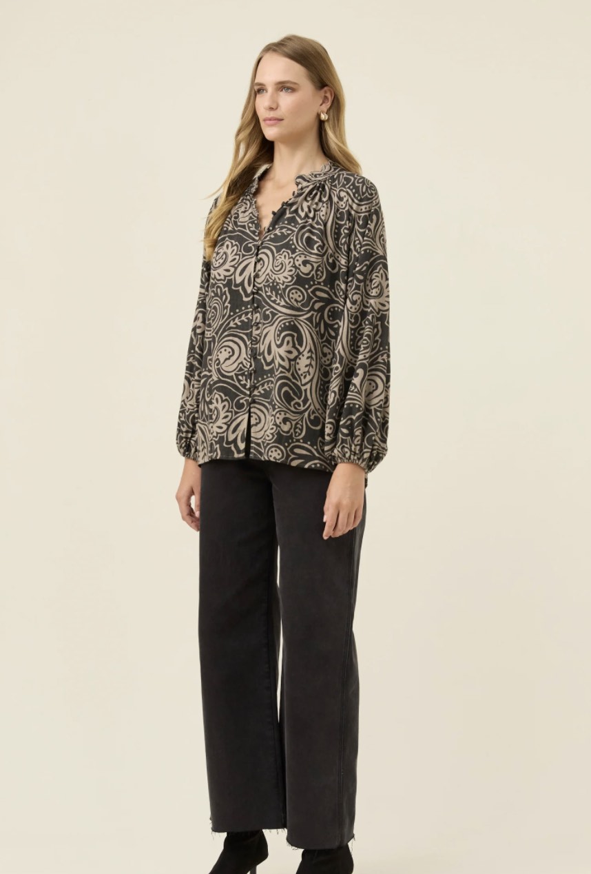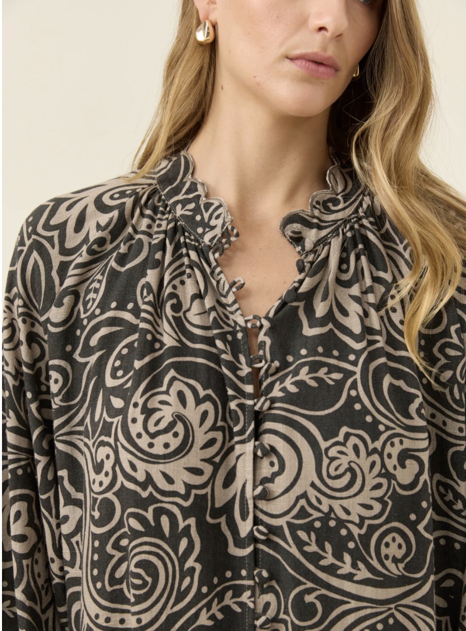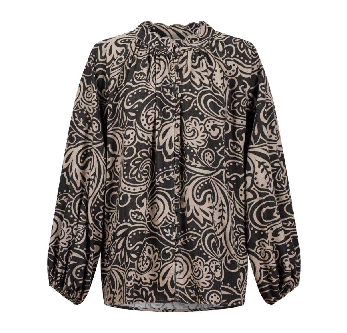 A lightweight blouse with a soft, airy feel and delicate details throughout. The stand collar is finished with scalloped embroidery, while the covered buttons sit neatly within the internal placket. Bishop sleeves fall into elastic cuffs, and gentle gathering at the back neckline adds movement. Pair with denim for everyday dressing or tuck into tailored trousers for a refined winter look.