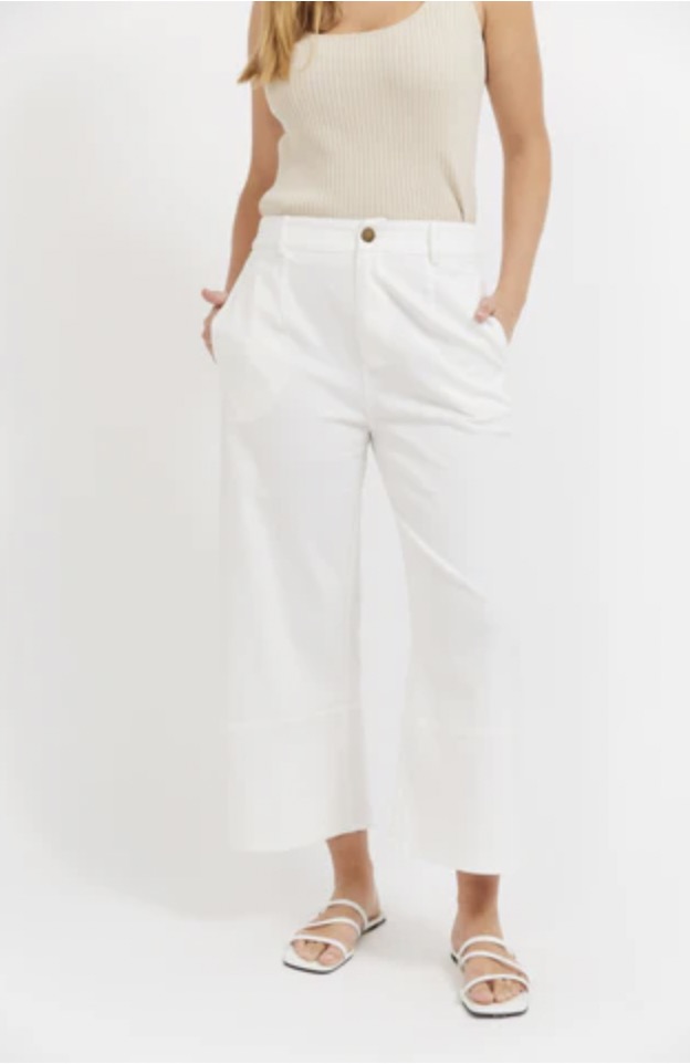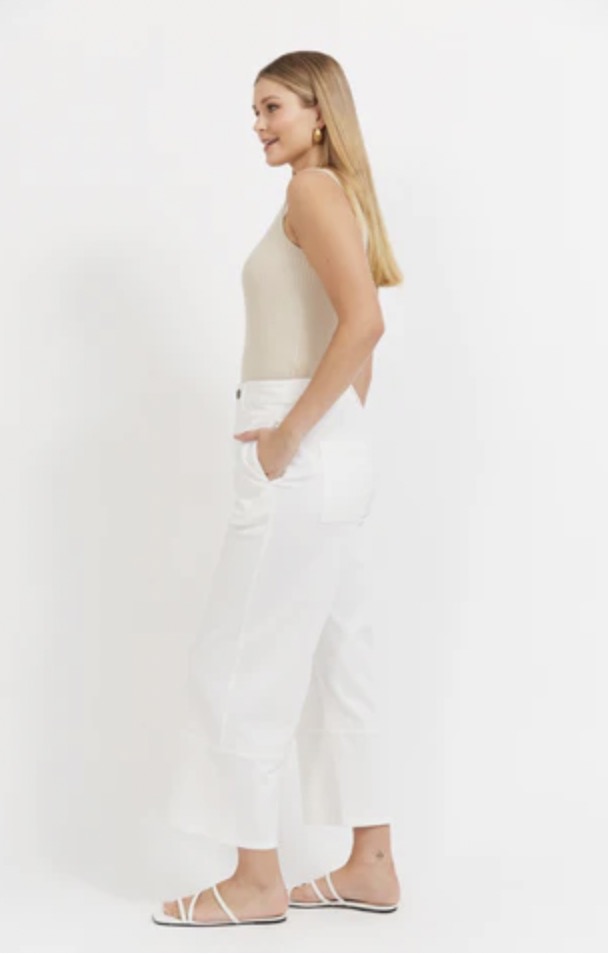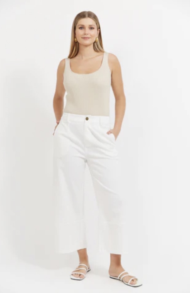 Vintage feel, modern cut. The Haiti Pant is a full-length summer staple with a flattering straight-leg silhouette and thoughtful nostalgic touches. Designed with a front button and fly closure, elasticated back waistband, and front patch pockets trimmed with playful ric-rac detailing.