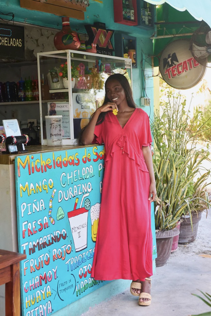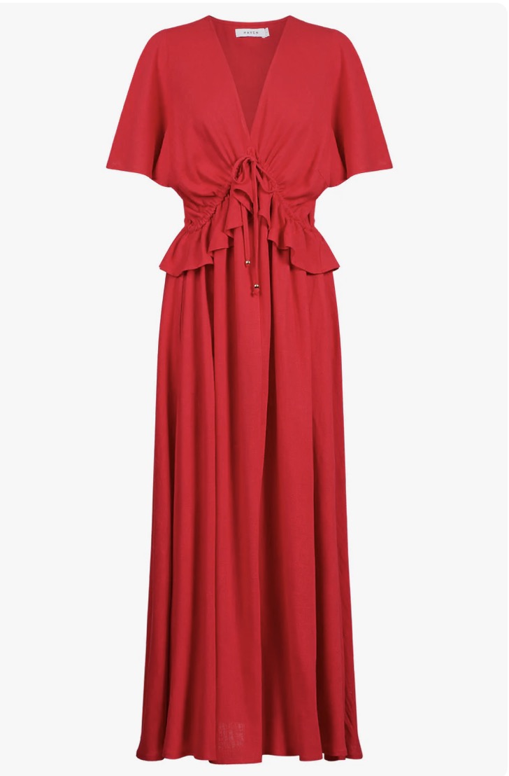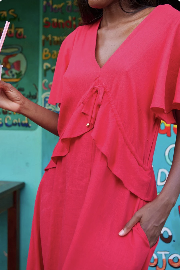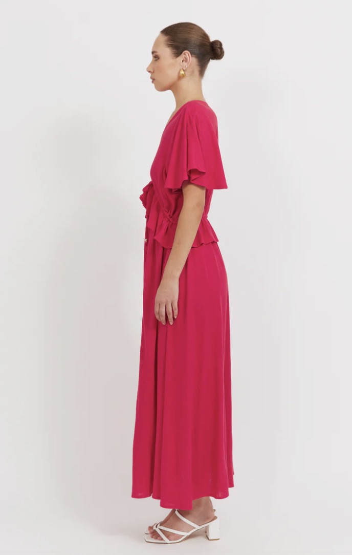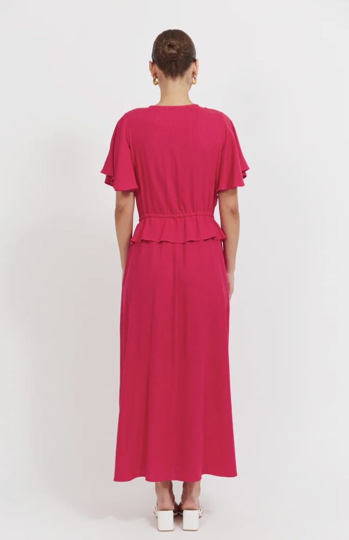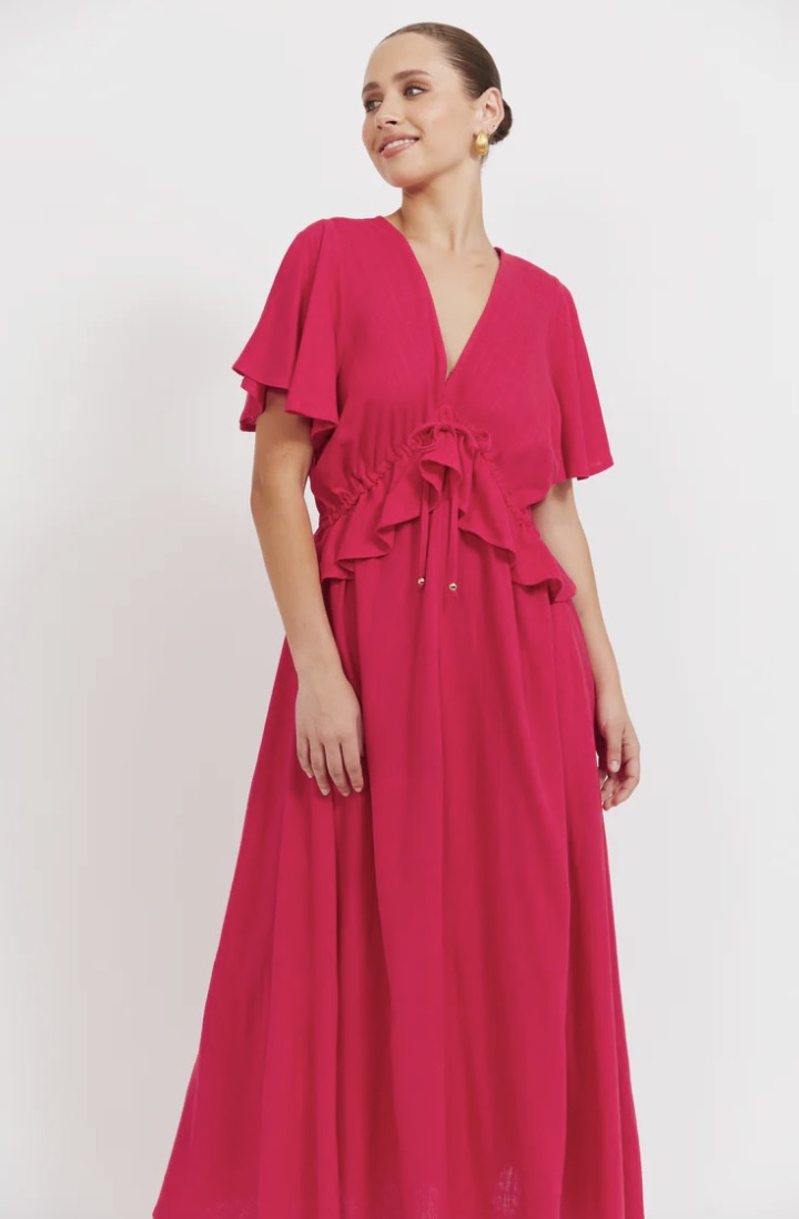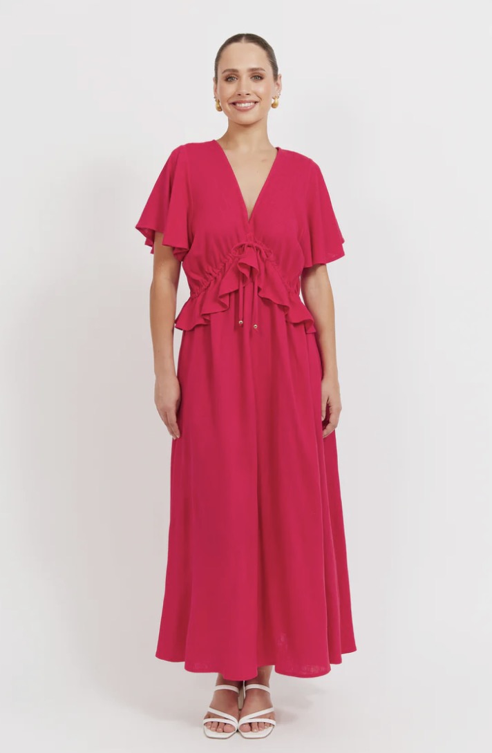 Feminine and flattering, the Jardin Frill Maxi Dress is designed with a soft V neckline, flutter sleeves, and an angled waist seam that flows into a gathered ruffle hem. The adjustable self-fabric drawstring lets you tailor the fit, while gold bead details add a subtle touch of polish. Crafted from a breathable linen blend and finished with hidden side pockets, it’s a style that balances beauty with practicality.