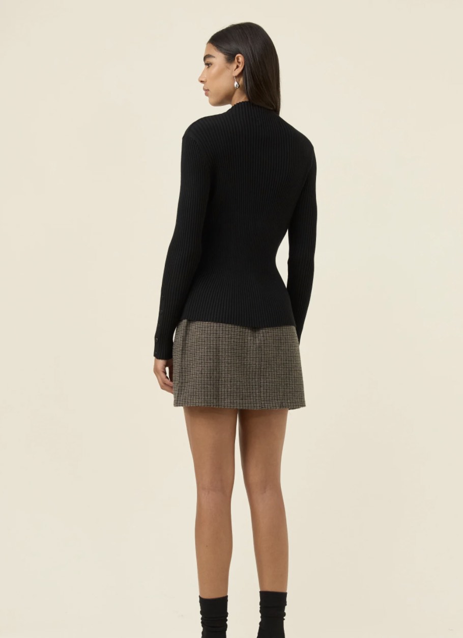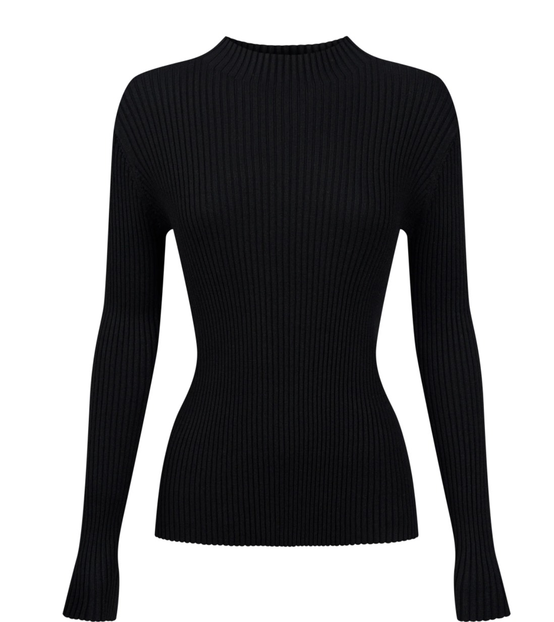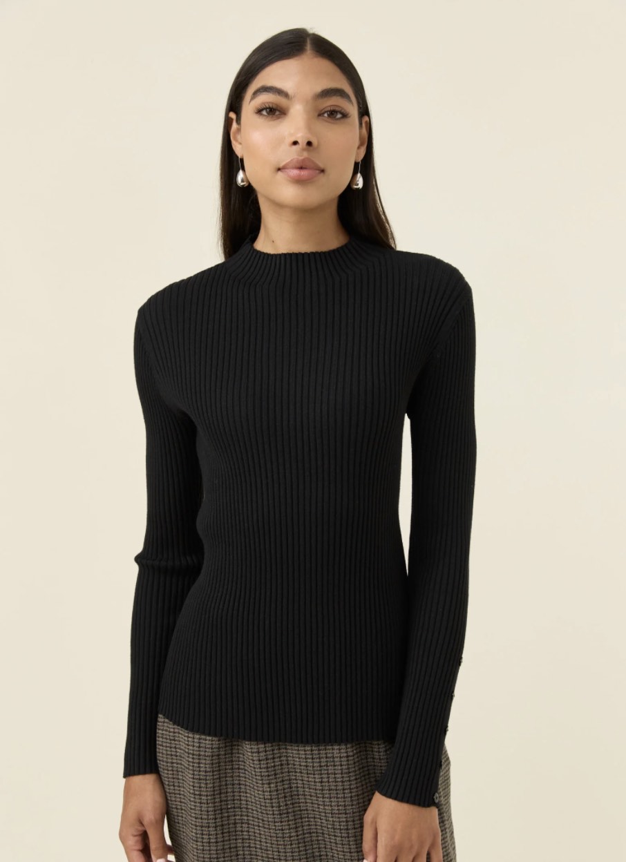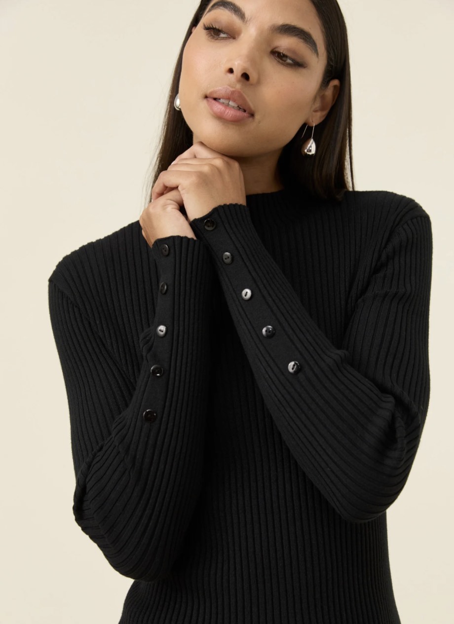 A fitted rib knit top designed with clean lines and a soft, stretchy feel. The small funnel neckline adds a refined touch, while the sleeve buttons bring subtle detailing to the minimalist shape.