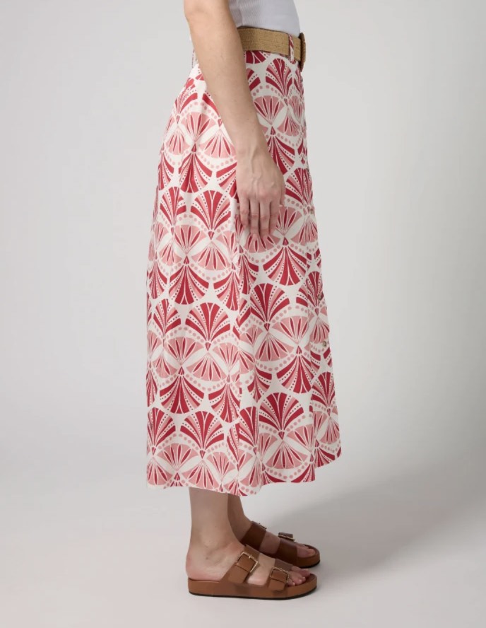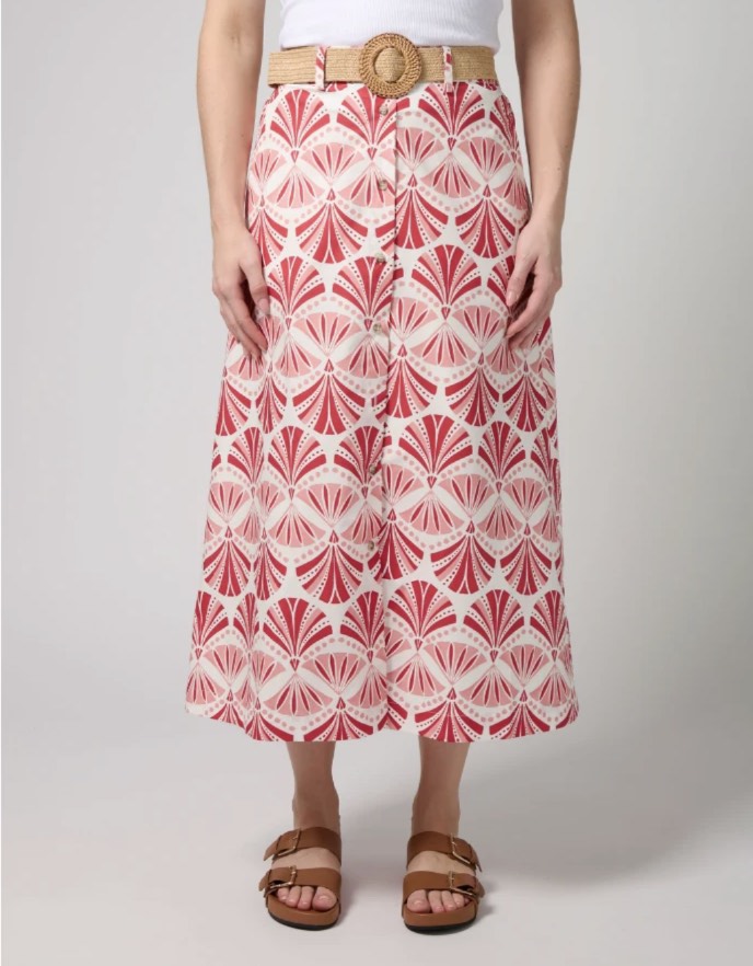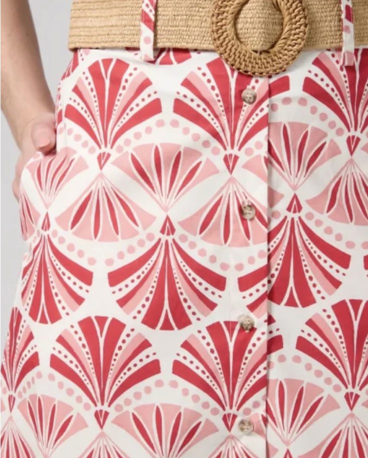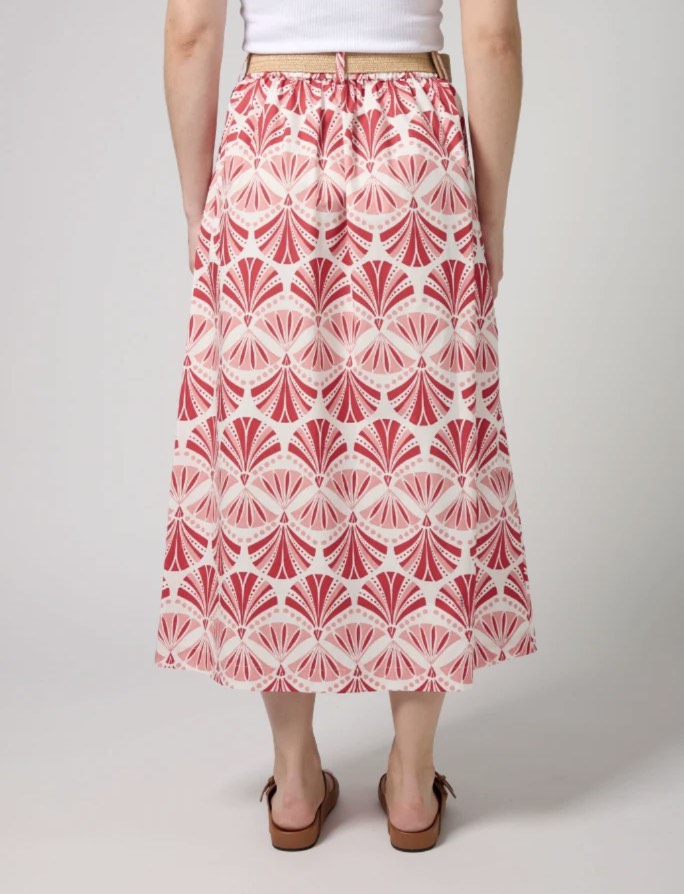 Ankle length A line button front skirt, with flat front waist and back elasticated waist. Removeable contrast raffia belt and buckle and side angle pockets