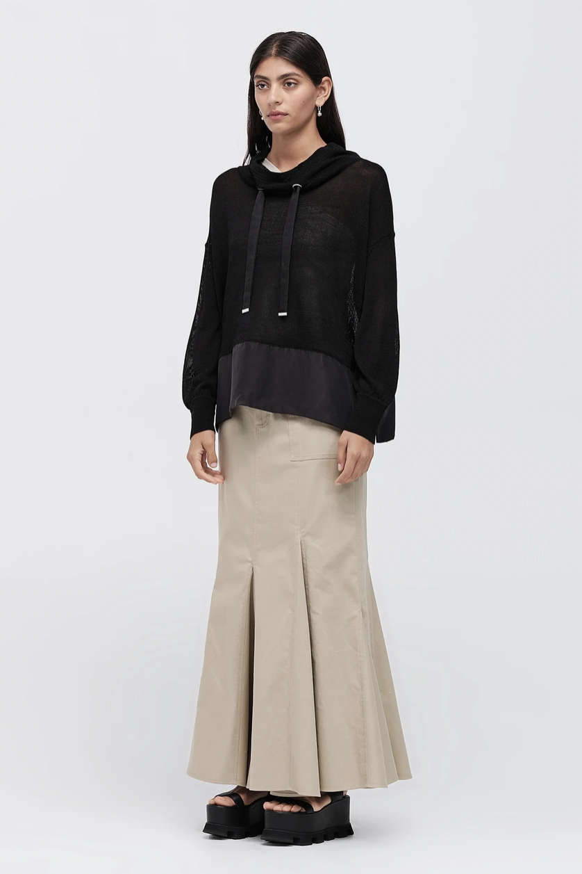 The Knitted Brink Sweater is a fresh take from our favourite Brink Sweater. This is an easy to wear piece that has many thoughtful details to elevate your weekend styling. The long sleeves are gathered at an extended cuff to create volume. The back unbuttons to further open the relaxed shape. Wide Viscose hem panels through the body artfully create clean contrast.