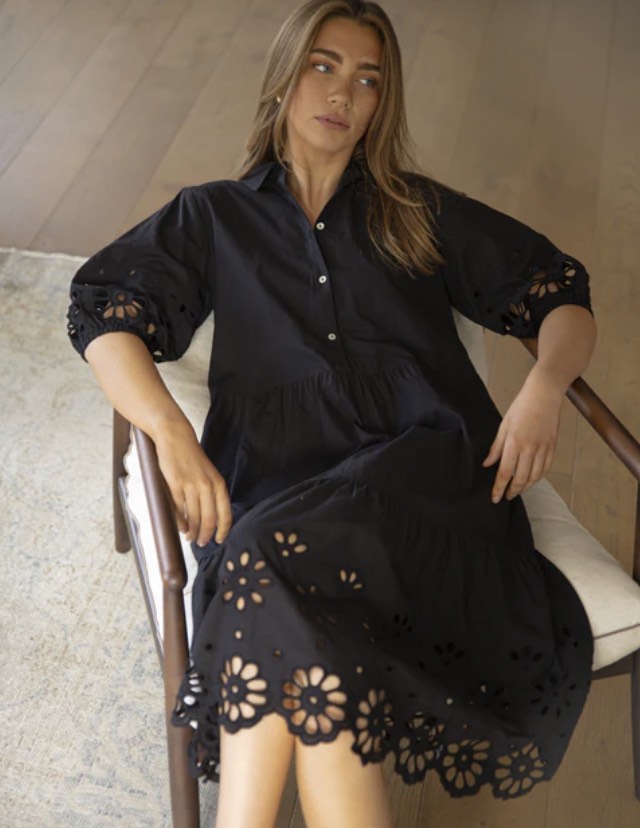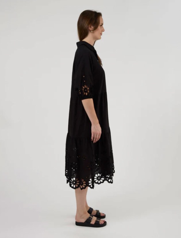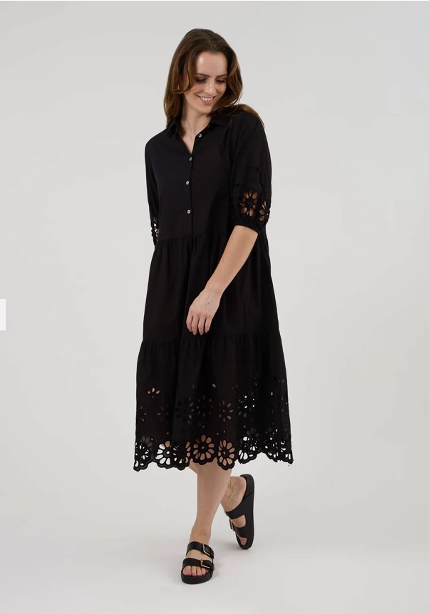 Midi length collared tiered dress with button front upper bodice. Open broderie detail on billowing sleeves and hemline. Elasticated sleeve cuffs and detachable slip lining