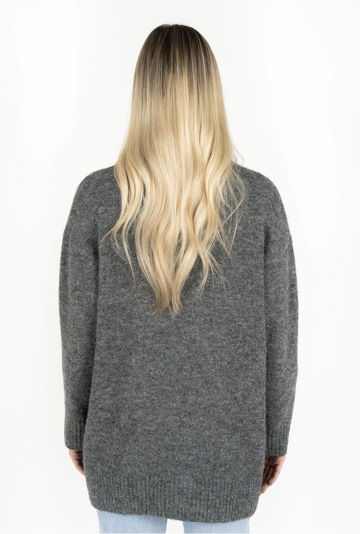 Crafted in a soft wool blend, it’s warm and cosy but not crazy thick or heavy (great tran-seasonal piece). An oversized, longer style offering great bum coverage – looks good with leggings or throw it on with your fave jeans