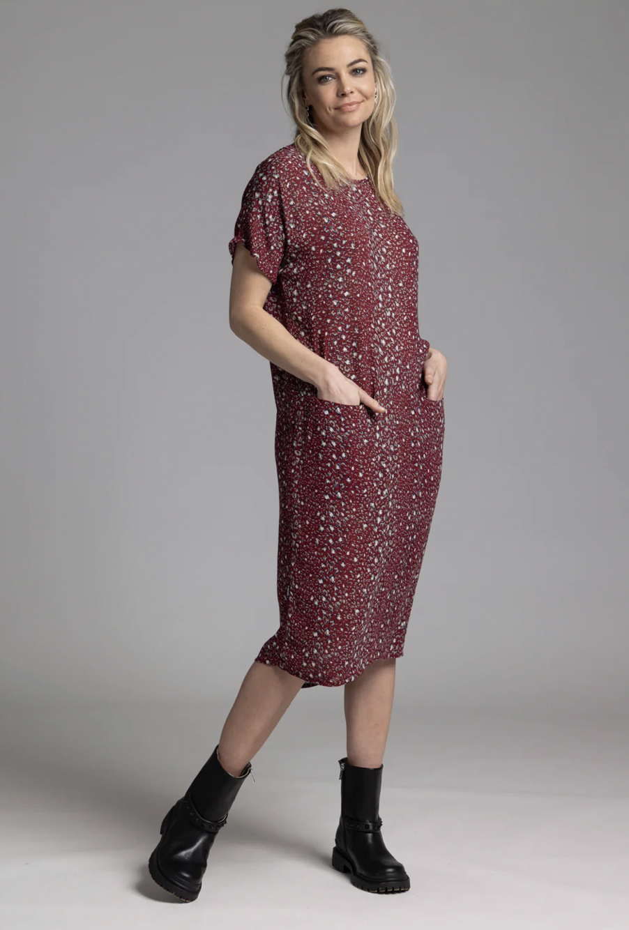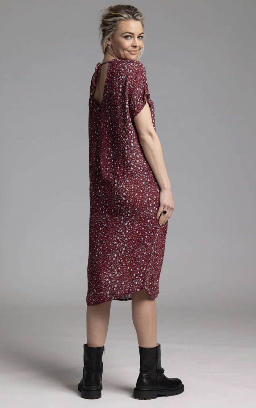The NES Leeway dress is a subtle bat-wing tee dress sitting just below the knee. Great throw-on piece that can be dressed up or down.