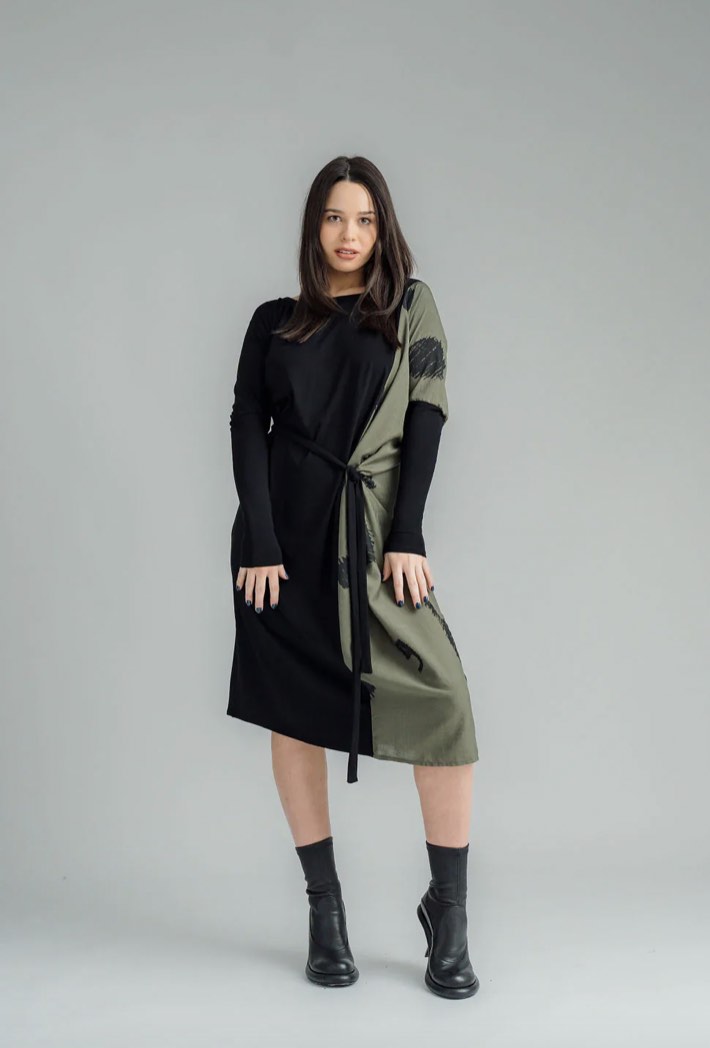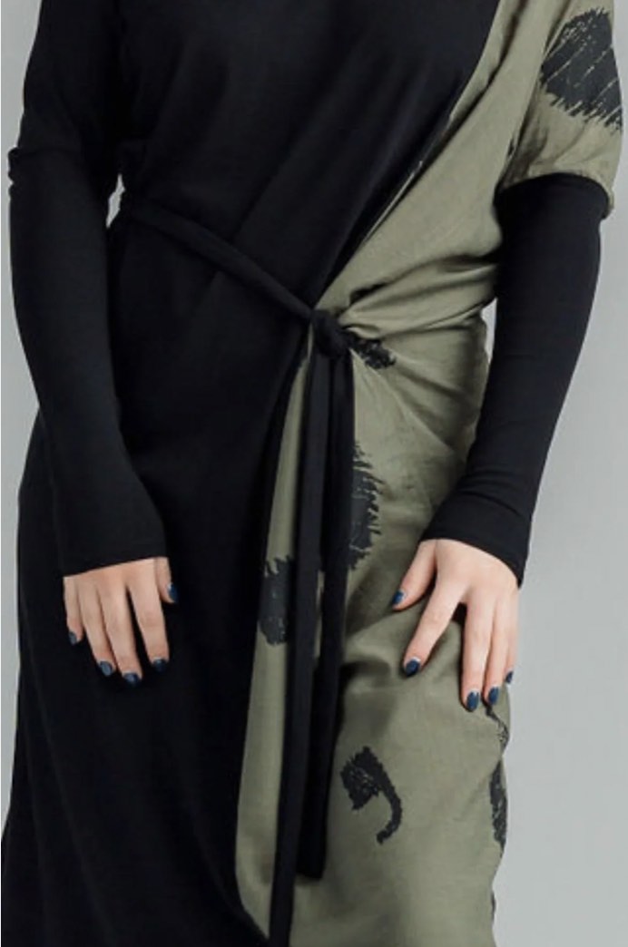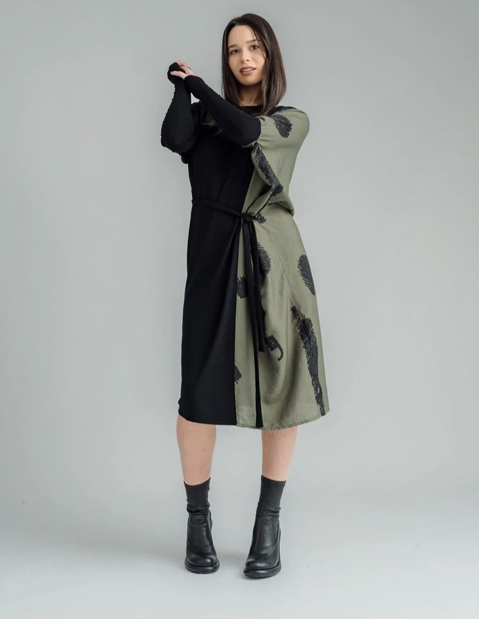 The NES Legend Dress is a stylish contrast fabric dress that effortlessly combines a woven print fabric with a soft, stretchy viscose for the perfect blend of comfort and style. This versatile piece is ideal for both work and casual wear, and can easily transition through the seasons. Layer with tights and boots for a chic winter look. Featuring a flattering batwing style with cigarette sleeves, an internal tie that can be adjusted to your preference—tight, loose at the front or back—this dress allows you to customize the fit and silhouette to suit your unique style. Embrace versatility and comfort with the NES Legend Dress, your new wardrobe essential.Â