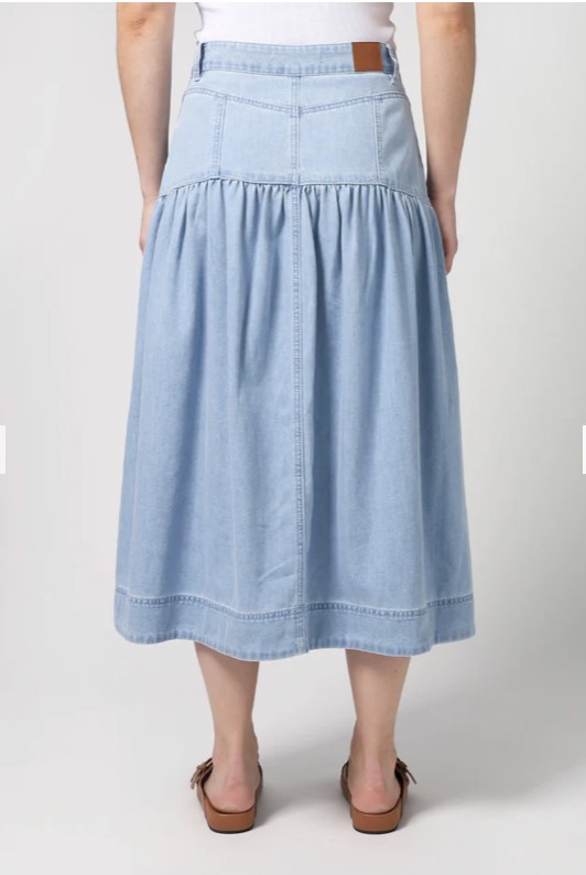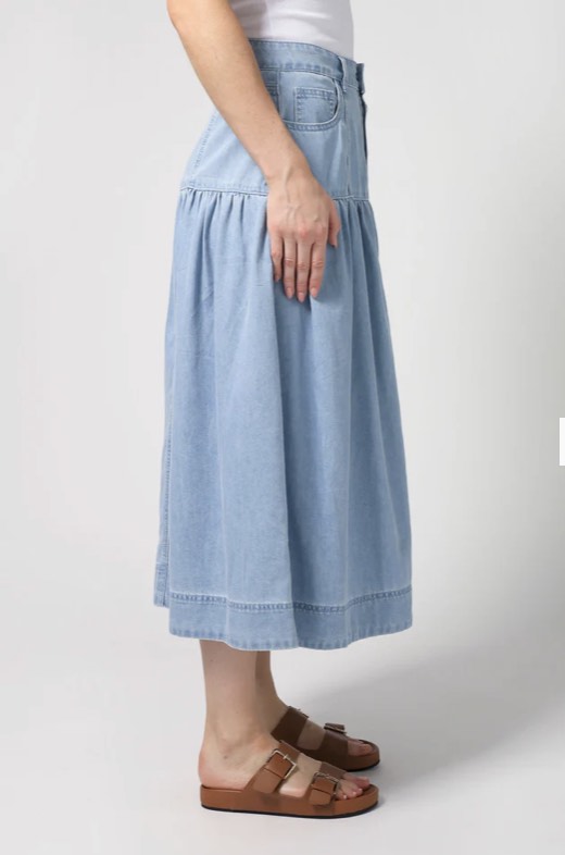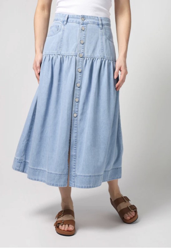 The Stella + Gemma Lou Skirt in Light Denim is a stylish and charming midi skirt perfect for your everyday wardrobe. This skirt combines a classic denim look with a flattering, feminine silhouette.