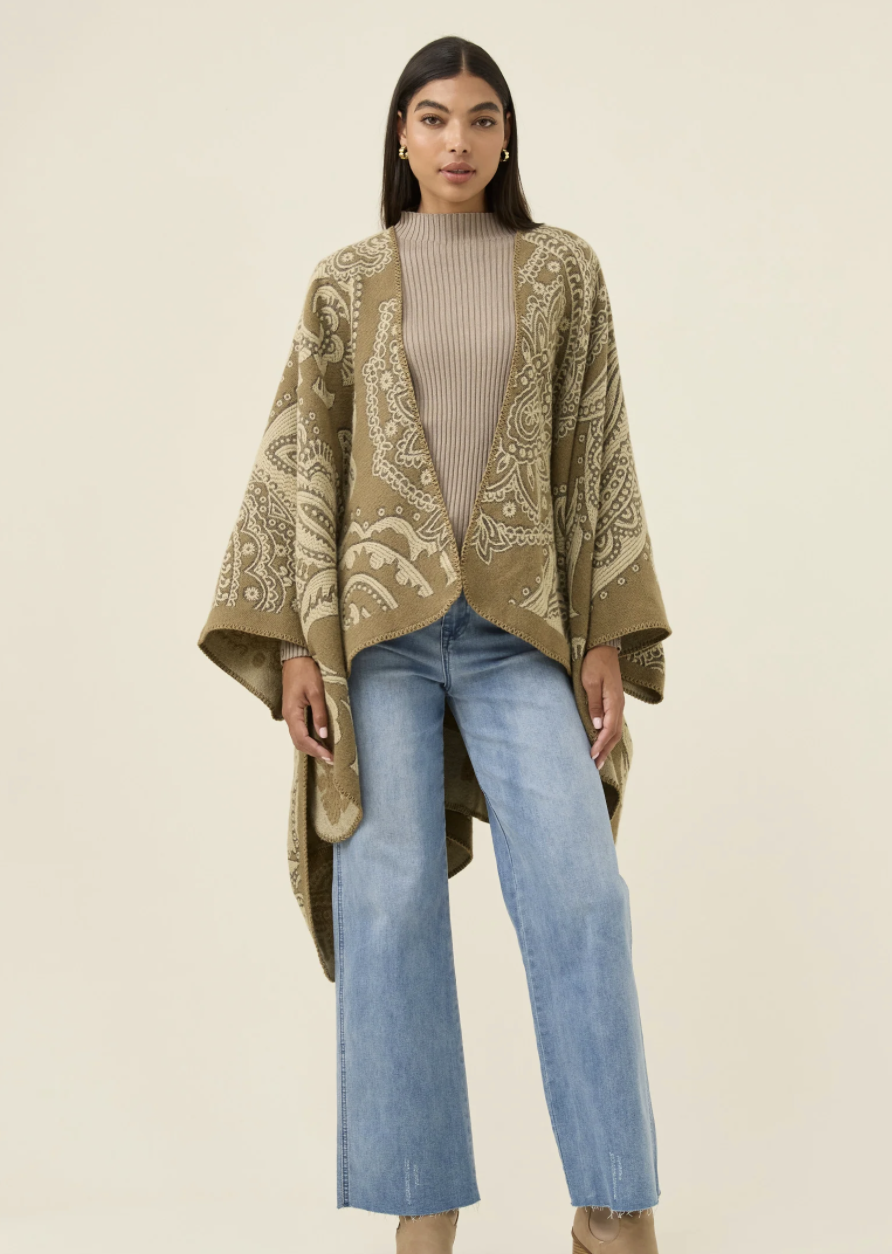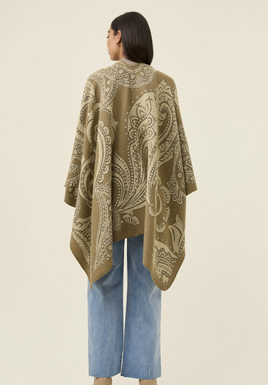 A soft jacquard cape featuring a woven paisley pattern with the option to wear on the reverse side. The oversized shape drapes gently, finished with buttoned sleeves and blanket stitching for a handcrafted touch.