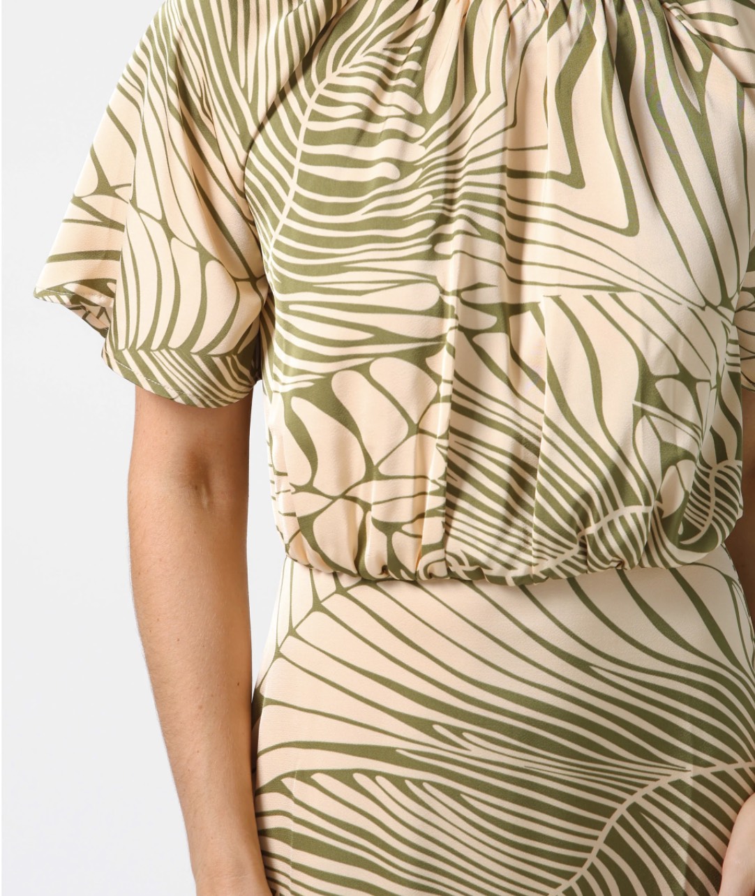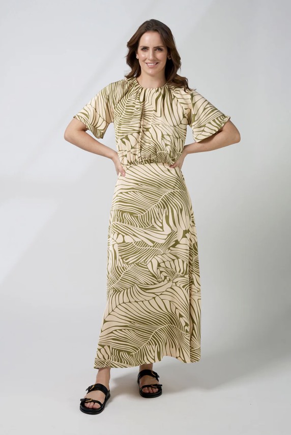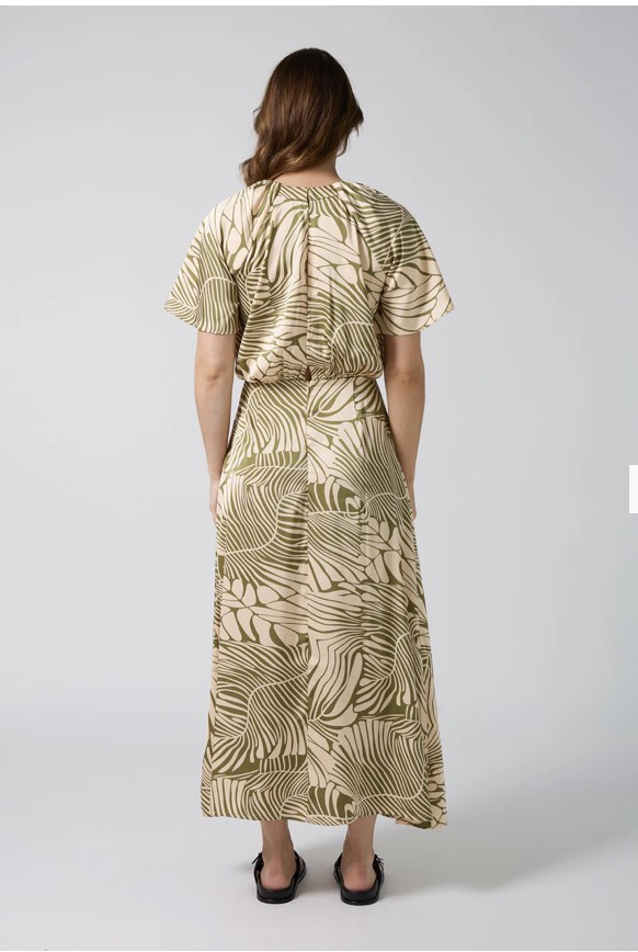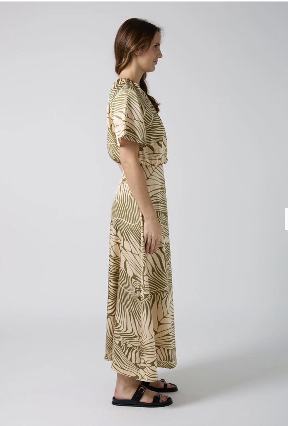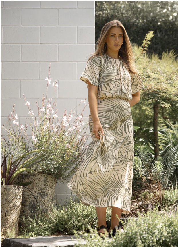 This gorgeous Maxi dress has a crew neckline and fluted sleeves with shaped waist. Fluid bias cut skirt and back split fastening with hook & eye closures