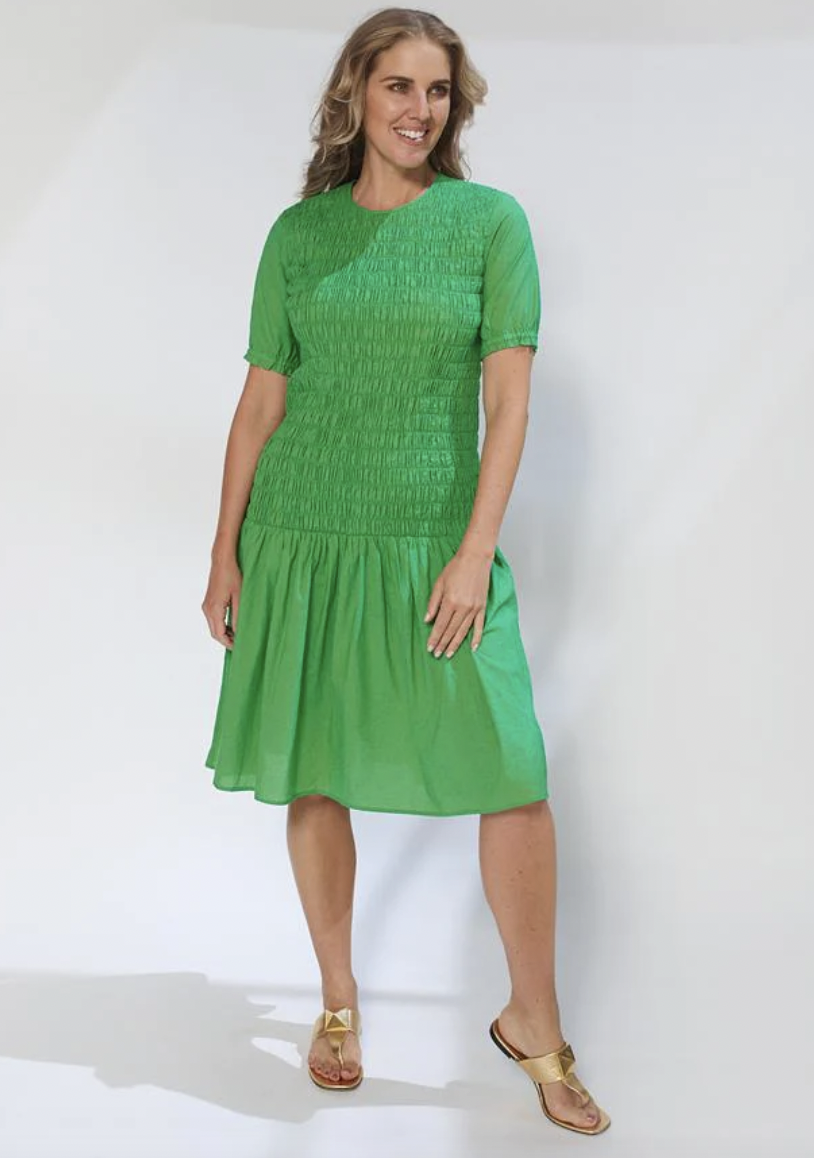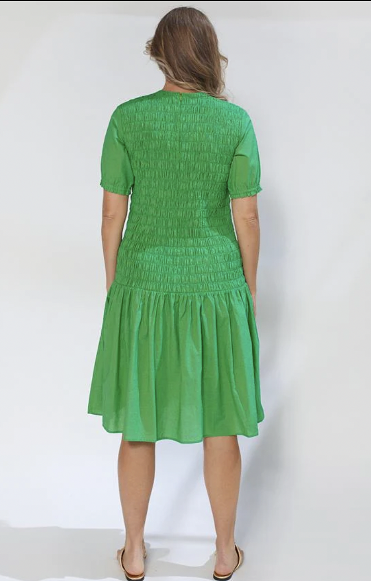 The Mei Dress is a crew neck dropped waist skater dress with wide shirring bodice & gathered short sleeve & elasticated cuff. A beautiful style!