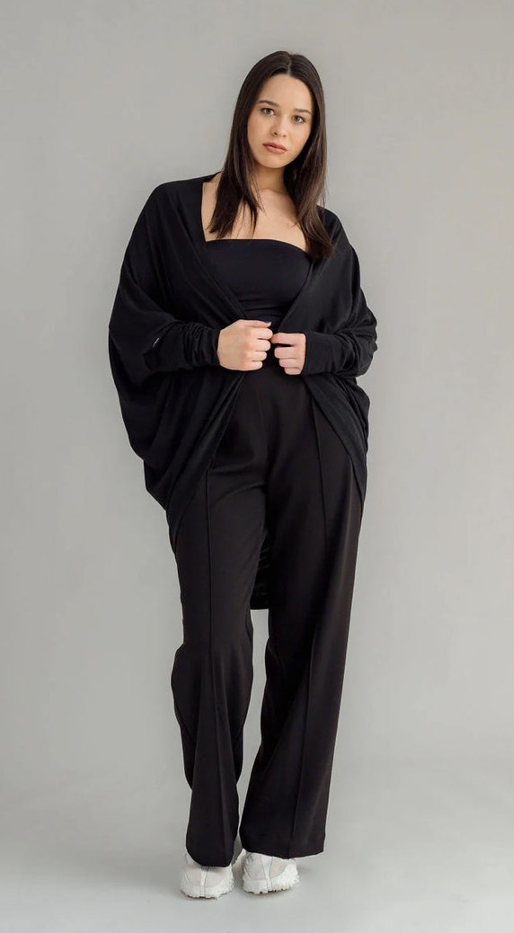 A NES favourite! Our NES Voltage cardi is perfect for layering or a great trans-seasonal piece, Flattering batwing sleeve, Dress up or down, Can be worn multiple ways – by flipping the cardi upside down so the hem is worn around your neck. by doing this you will get either a shorter hip length cardi or a longer length cardi – falling mid thigh (at the back)