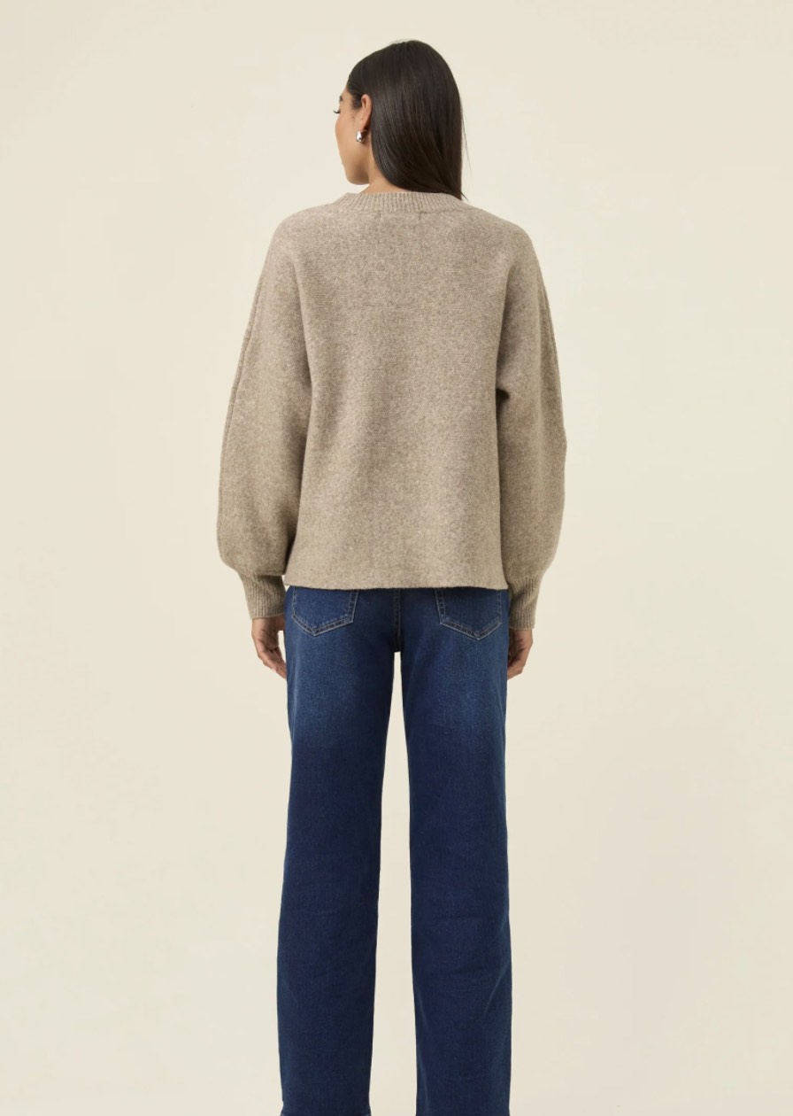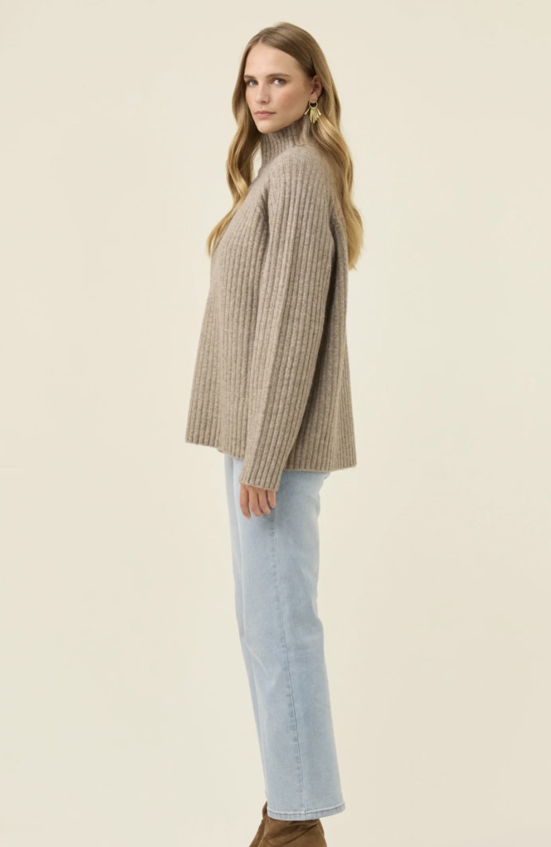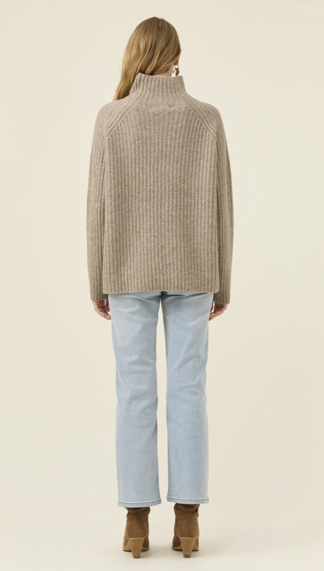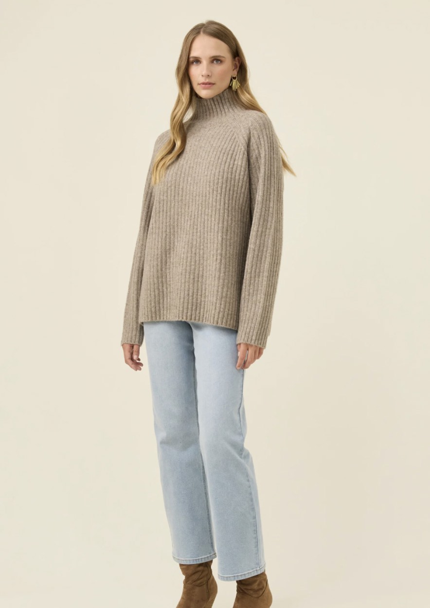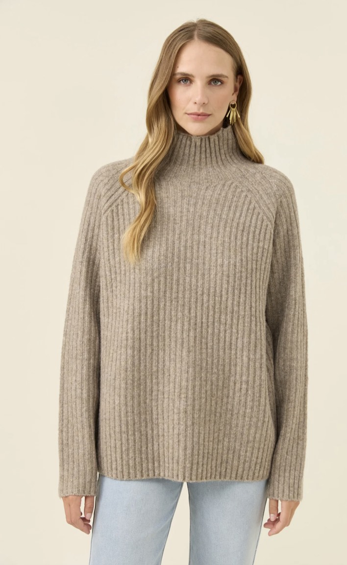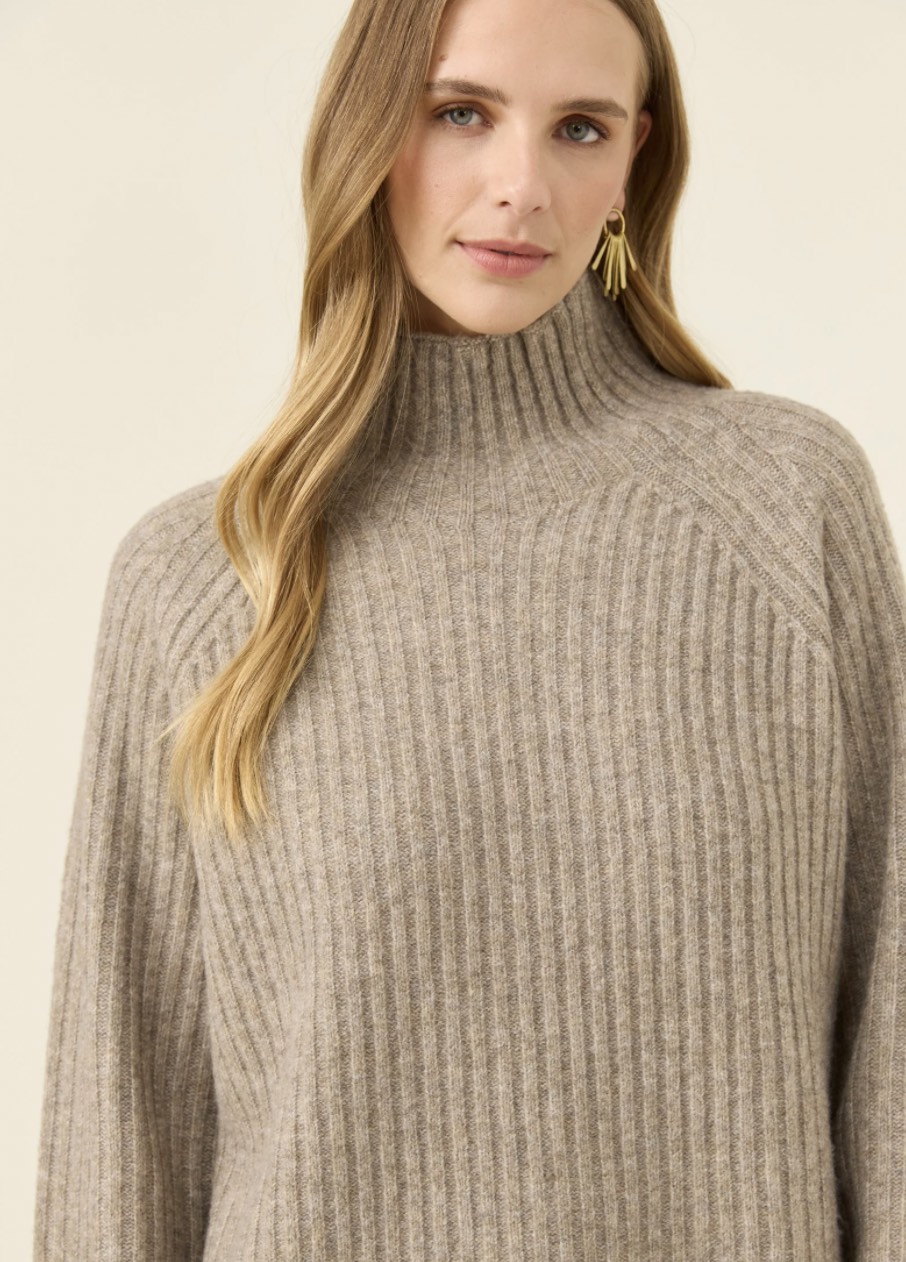 A cosy funnel-neck jumper with a relaxed shape and a soft ribbed knit that feels warm without weight. Raglan sleeves add ease through the shoulders, making it an effortless layer for cool days.