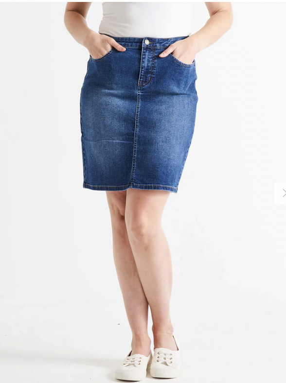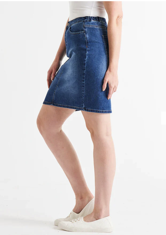 The Nala Denim Skirt – your go-to for relaxed style and comfort! With a fly front featuring a button, an elastic back waist for the perfect fit, a back split, and functional pockets, this skirt is perfect for those laid-back, fun, and effortlessly chic days. Elevate your wardrobe with the Nala Denim Skirt for the perfect blend of fashion and comfort.