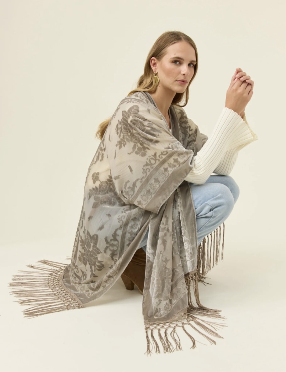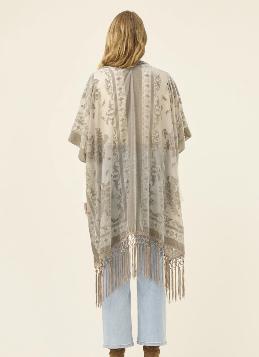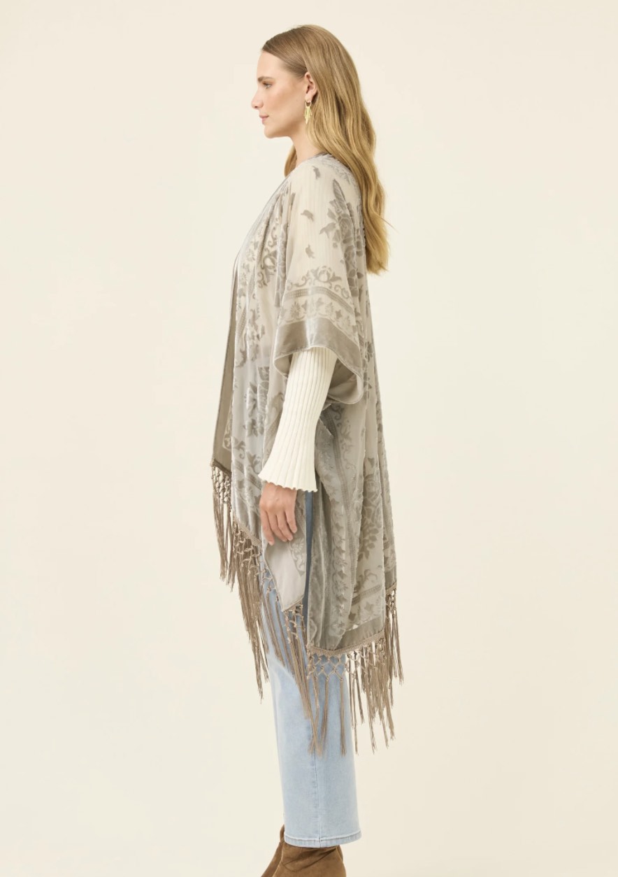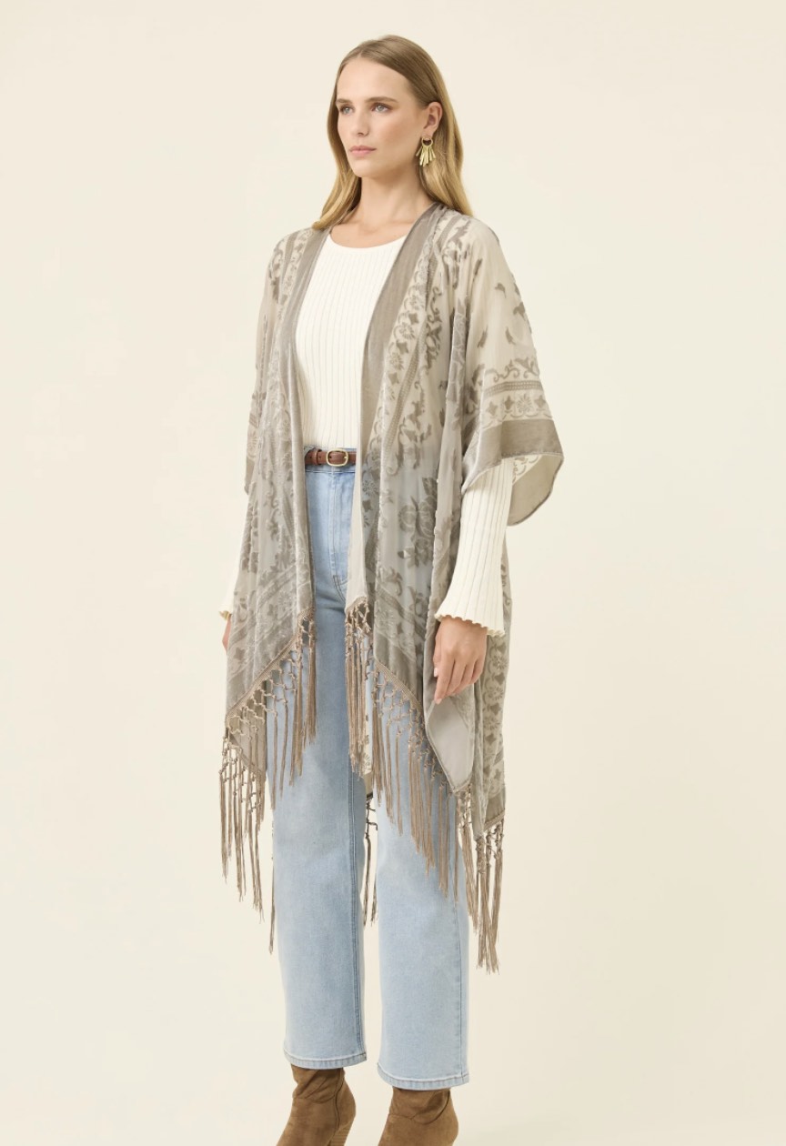 A statement layer crafted in burnout velvet with a delicate paisley pattern that catches the light. The relaxed silhouette, short sleeves and tassel hem create soft movement, making it an effortless piece to drape over simple winter basics.