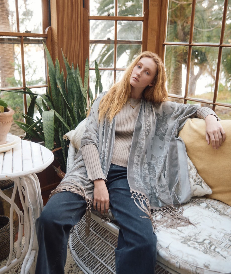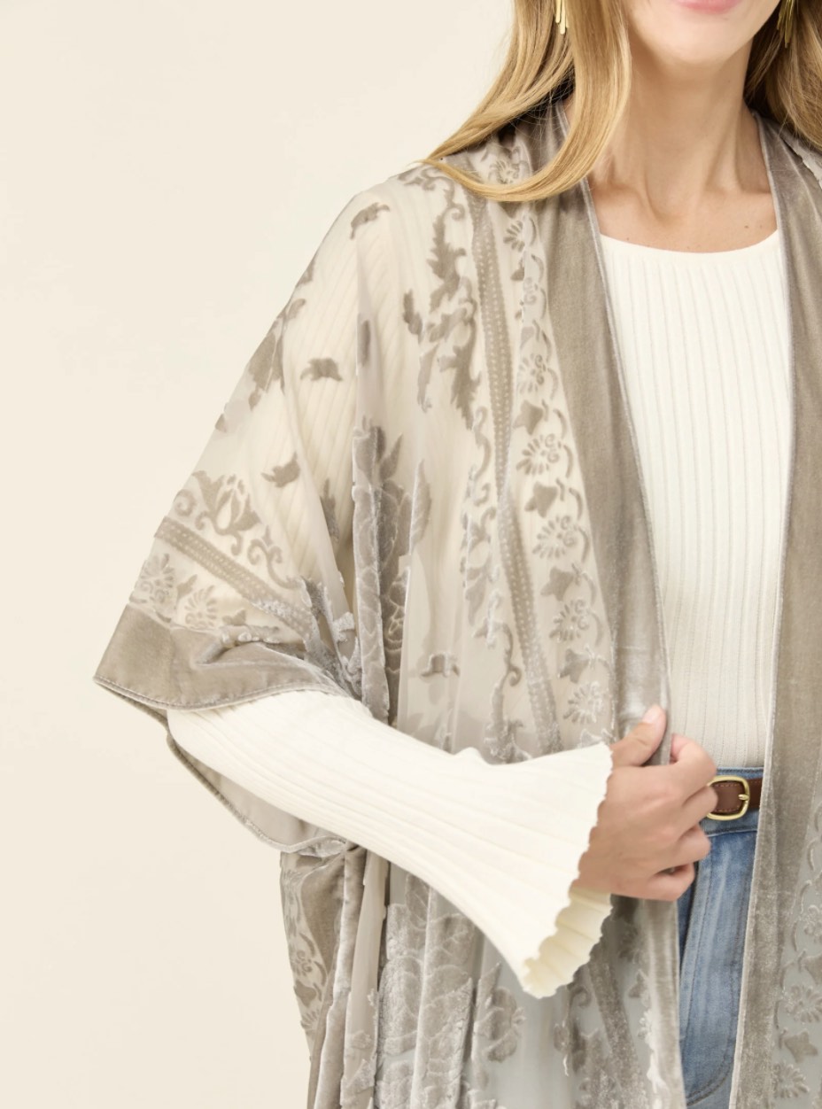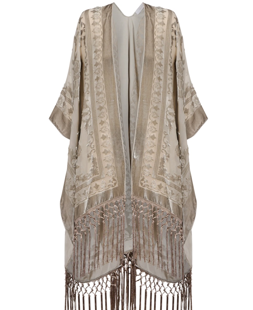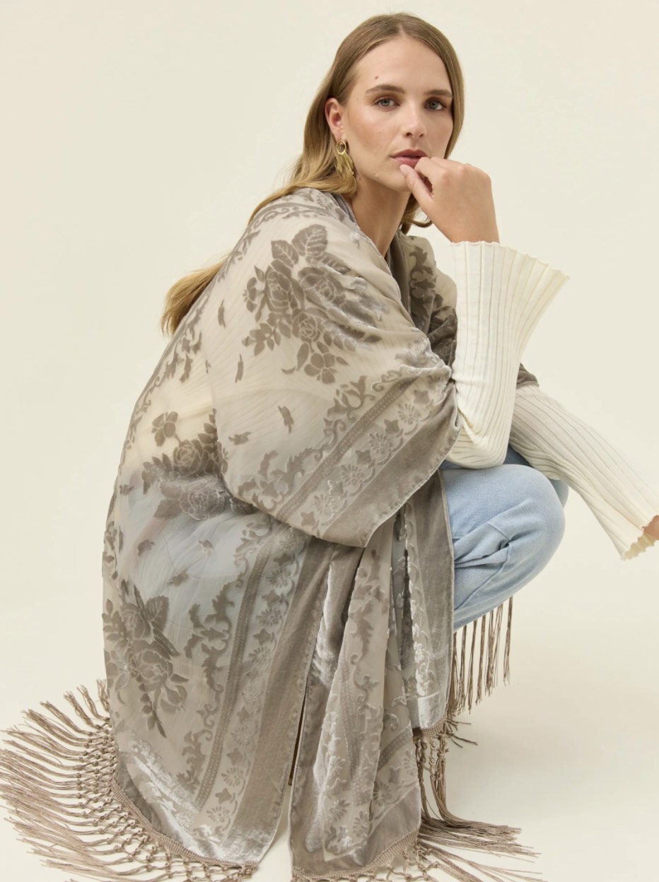 A statement layer crafted in burnout velvet with a delicate paisley pattern that catches the light. The relaxed silhouette, short sleeves and tassel hem create soft movement, making it an effortless piece to drape over simple winter basics.