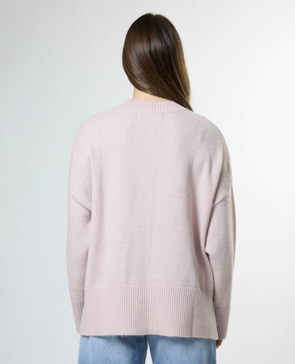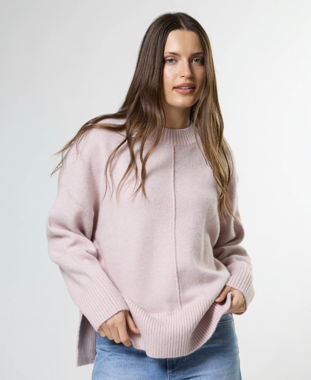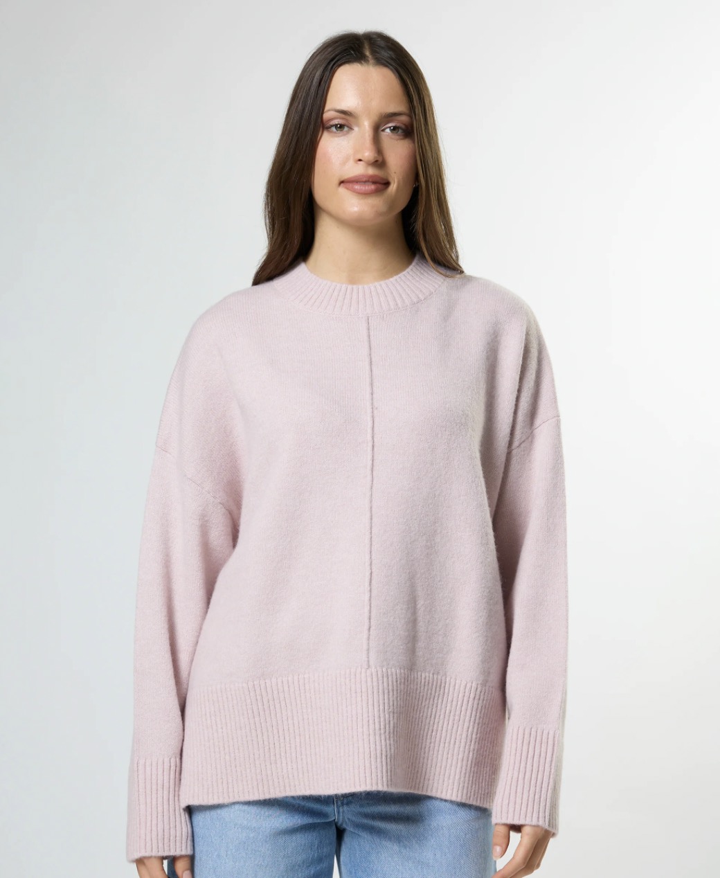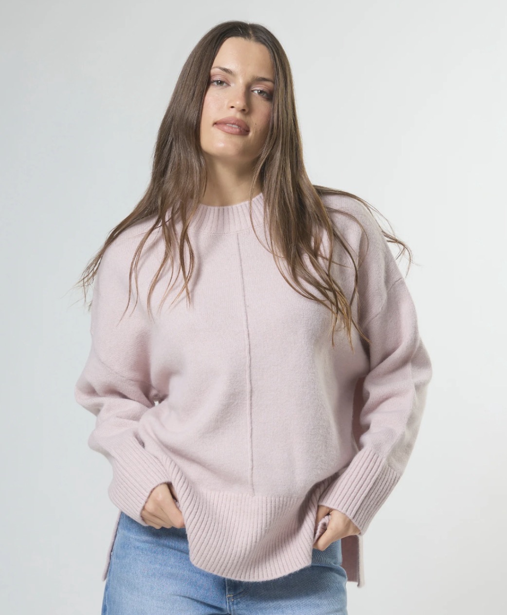 Relaxed fit knit with ribbed neckline and trims and centre front exposed seam.