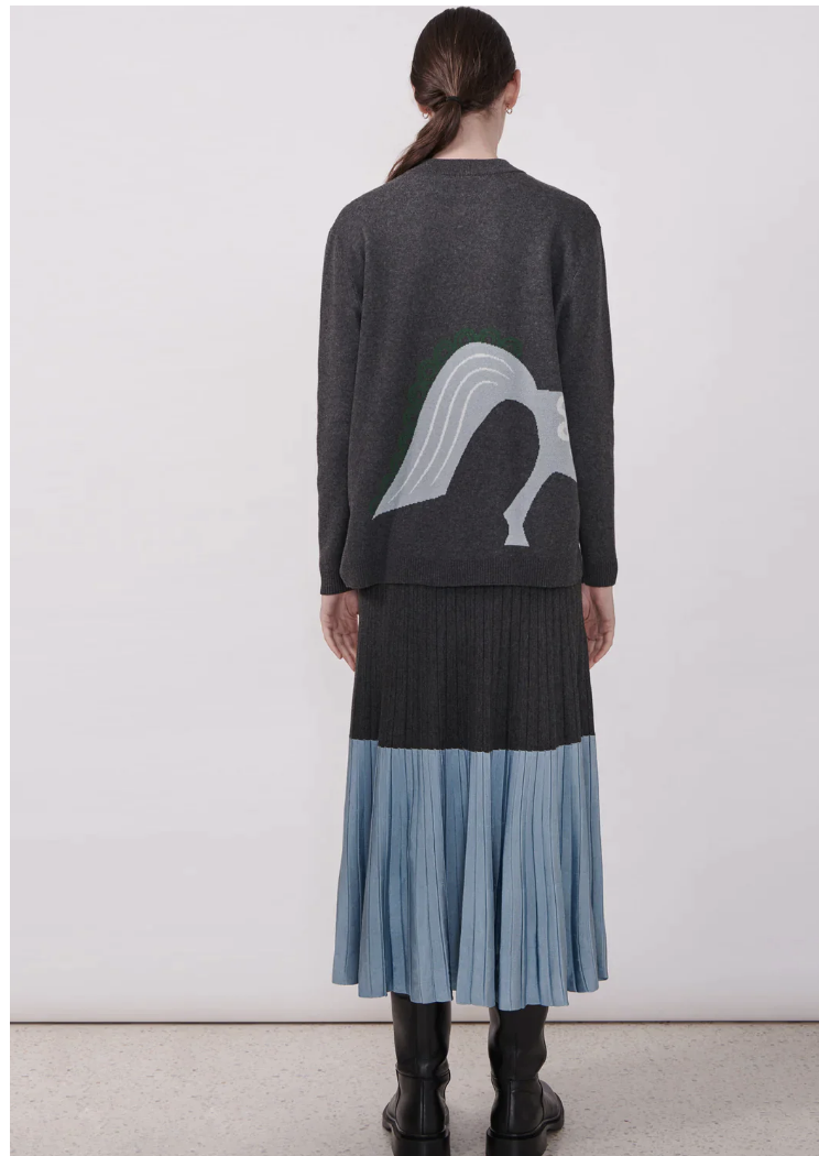 -Light blue, green and white pony intarsia detail wraps around from the front to the back.