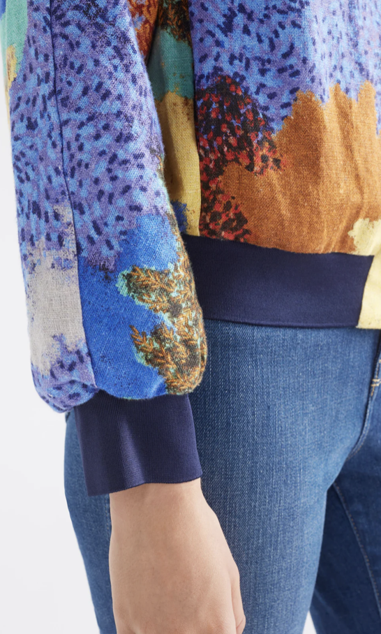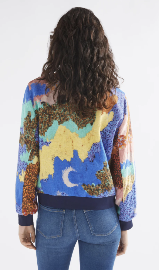The Reve Jacket is a bomber-style jacket in a printed linen. This fully lined jacket features a navy rib detail at the neck, hem and sleeve cuff, as well as an exposed front metal zipper. There are side pockets and a handy internal jet pocket. The sleeve is slightly wide, and features a batwing style at the front and a set-in sleeve at the back for an enhanced fit. Style note: this print is yardage, so each piece will have a unique print placement.